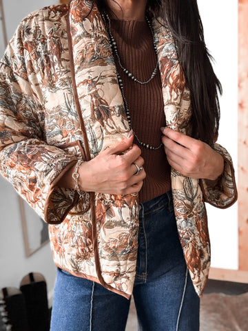 The Cowboy Quilted Jacket is pure western charm, lightweight, cozy, and made for cowgirls who love a vintage touch. Covered in a classic cowboy-and-desert print with contrast brown trim, this cropped layer brings all the rodeo vibes.
