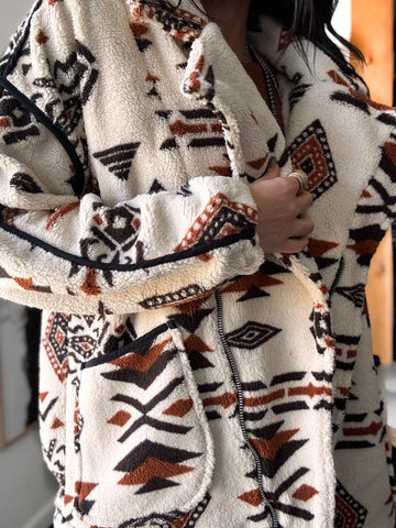 The Geo-Print Sherpa Fleece Zip-Up brings cozy comfort and western flair together. Featuring a bold geometric pattern on ultra-soft sherpa fleece, this jacket keeps you warm without sacrificing style. Perfect for chilly mornings, bonfire nights, or layering over your go-to knits.