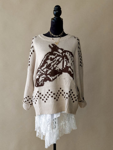 The Horse Printed Knit Sweater in Taupe is a statement piece with timeless western flair. Made for cozy layering, it features a bold horse graphic across the front and is crafted with a warm wool blend.