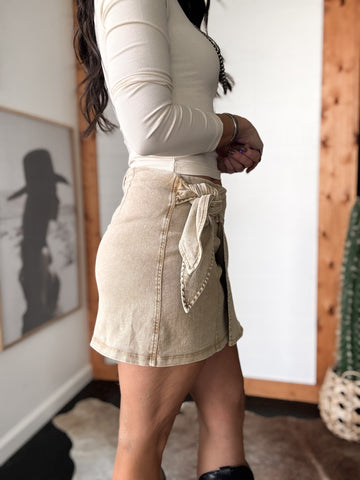 A little western, a little modern edge—the Tie-Front Khaki Denim Mini Skirt is your new go-to. Designed with a wrap-style front and bold tie detail, it blends rugged denim vibes with chic feminine flair. The faded khaki wash adds a vintage touch, making it easy to dress up with tall boots or keep casual with sneakers.