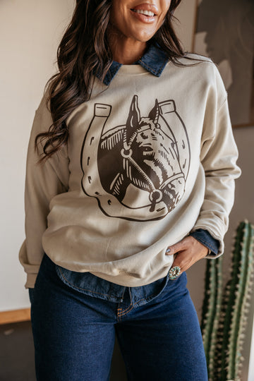 • Sand crewneck sweatshirt with bold horse + horseshoe graphic
