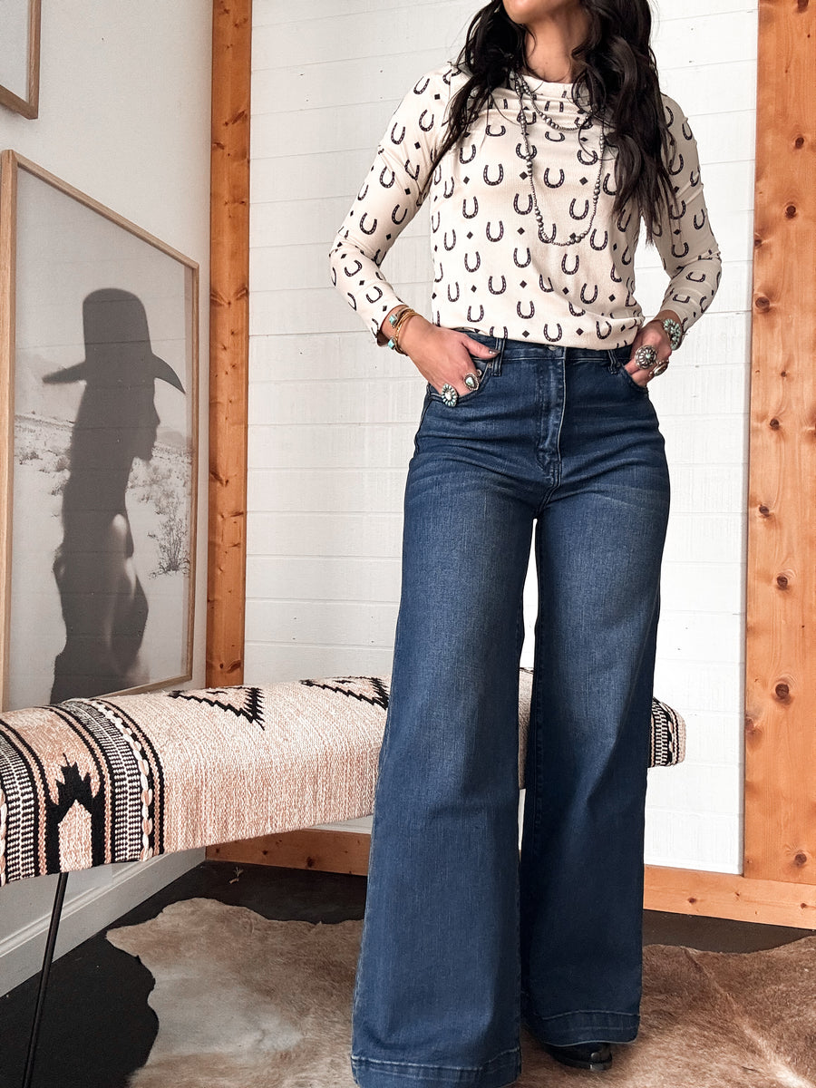 High-Rise Folded Hem Wide Leg Jeans - Dark Wash