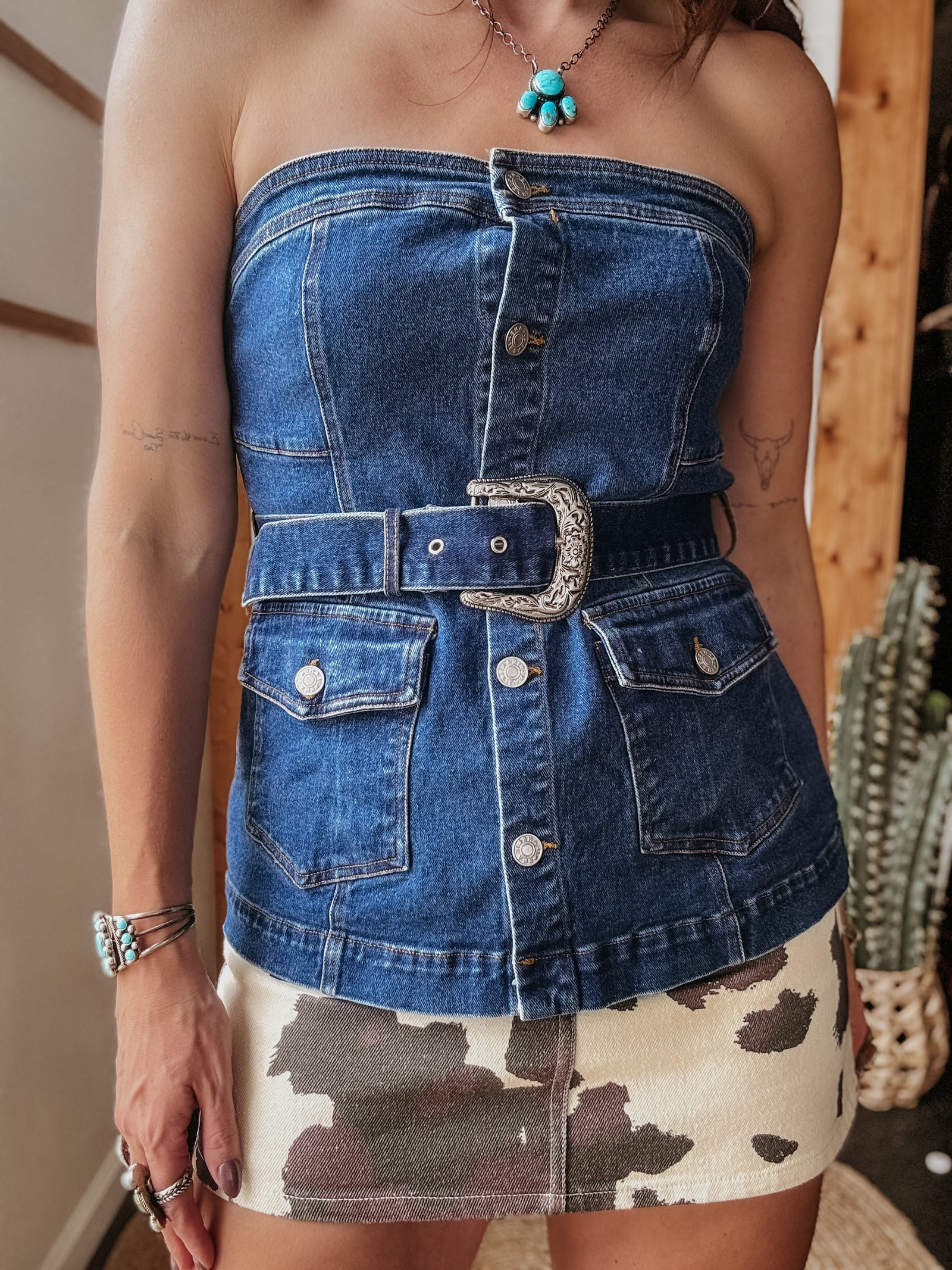 Western Buckle Strapless Denim Bustier Top