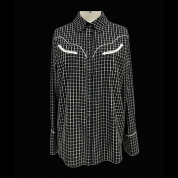 The Black Check Plaid Pearl Snap blends classic western details with a sleek, modern feel. Designed in a timeless black check plaid with contrast white piping, it features a pearl snap front closure and western yoke for that authentic cowgirl touch.