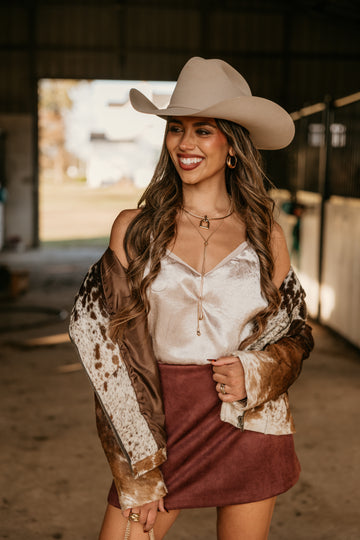 Sleek satin camisole in a soft champagne tone. Light, smooth, and easy to dress up or layer under a jacket or cardigan.