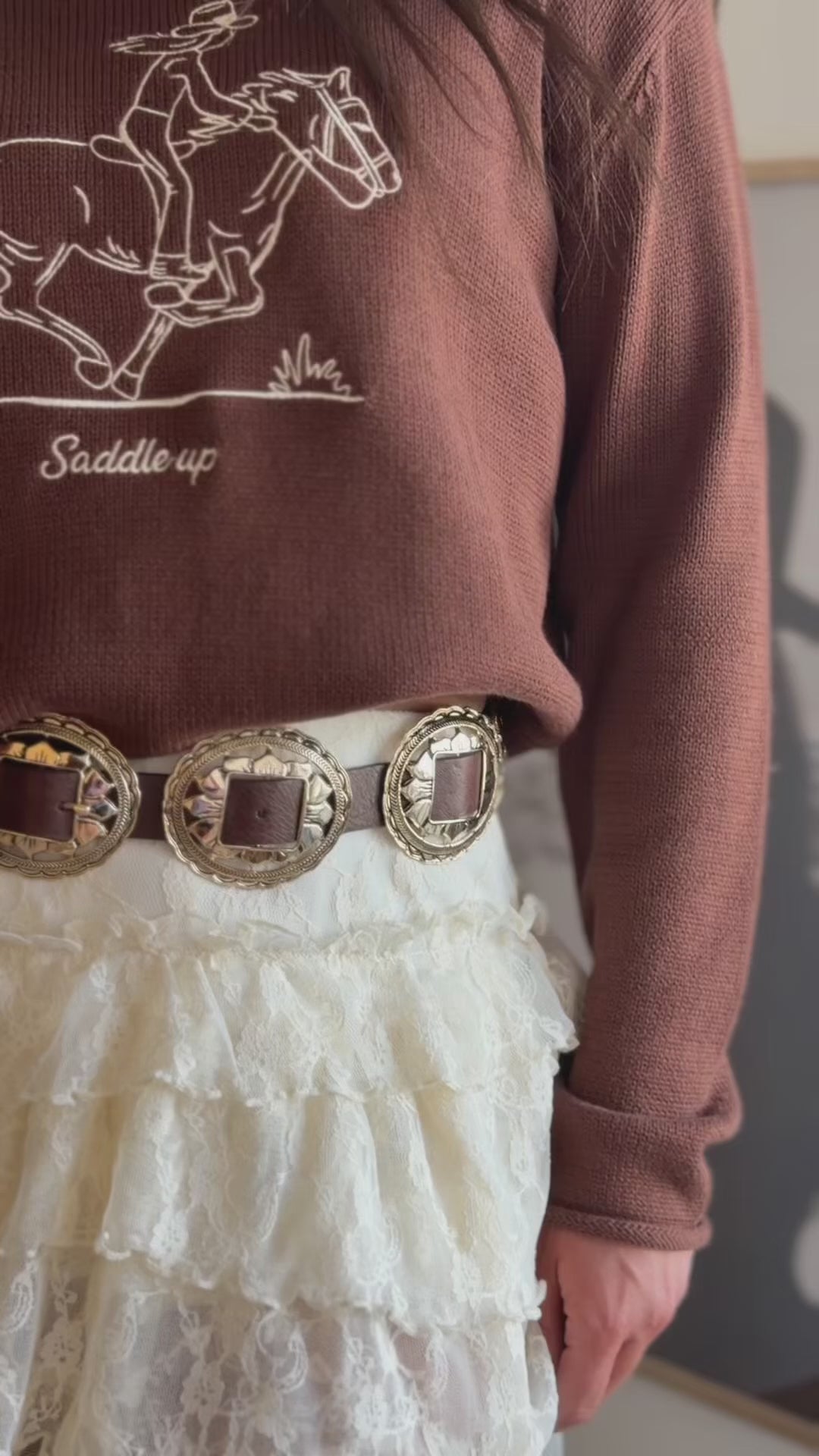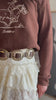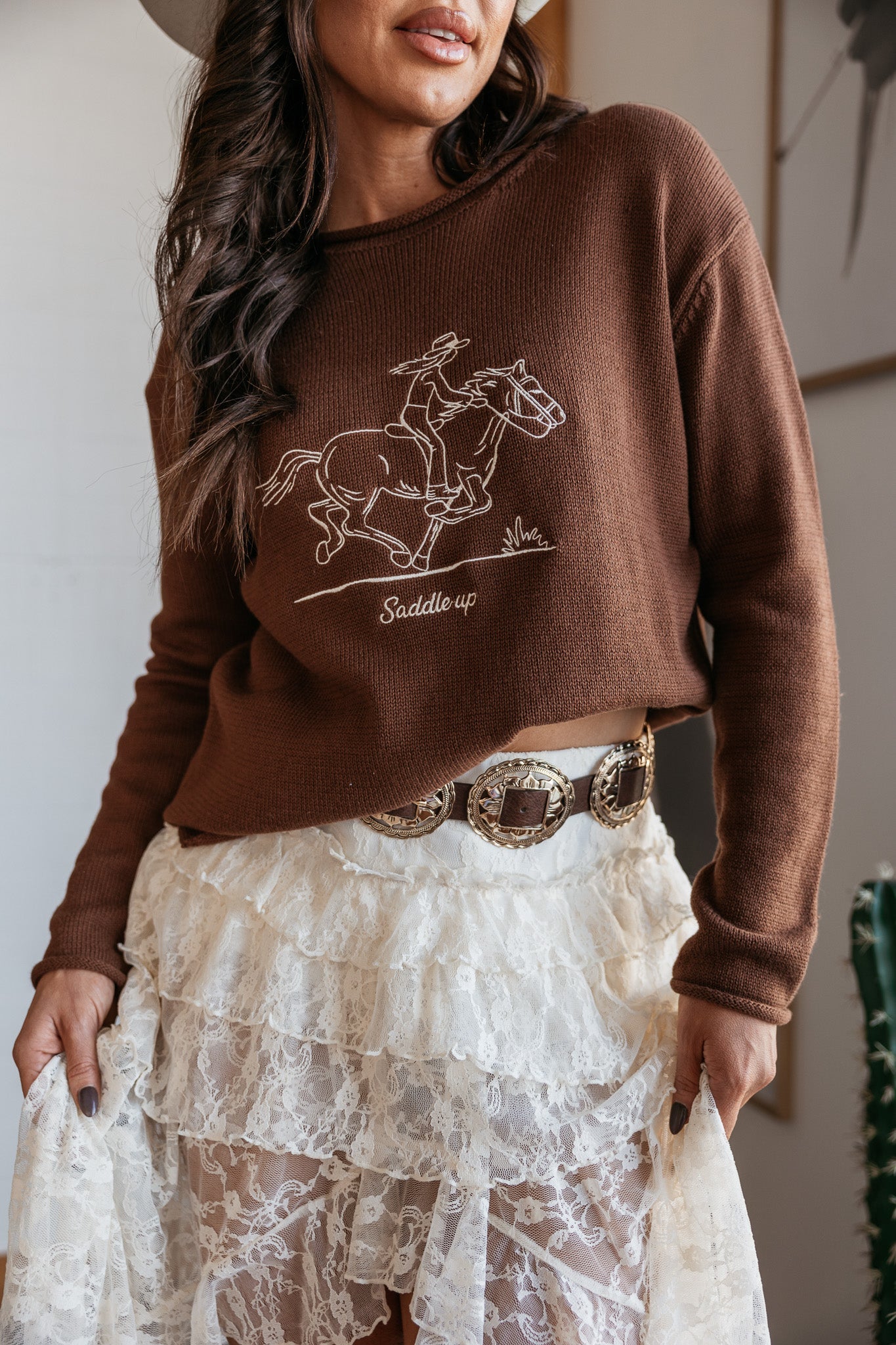 For the cowgirl who loves a soft, easy layer with a side of sass. This light knit sweater features a fully embroidered western cowgirl on horseback with the phrase “Saddle Up” stitched beneath. The neutral cream color makes it an effortless match with denim, boots, or your favorite shorts. It’s soft, breathable, and true to size—perfect for early mornings at the rodeo or slow coffee days on the porch. A statement piece that still feels cozy and wearable.