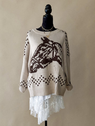 The Horse Printed Knit Sweater in Taupe is a statement piece with timeless western flair. Made for cozy layering, it features a bold horse graphic across the front and is crafted with a warm wool blend.