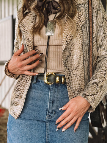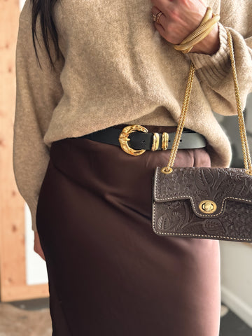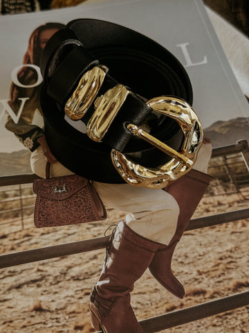MATERIALSThe Western Athens Belt is expertly crafted from real black leather, adorned with a gold central buckle and two wave-inspired gold loops. Made from handmade zamak, each belt may have slight variations. Choose from 8 different lengths for the perfect fit. Elevate any outfit with this boho-inspired accessory.