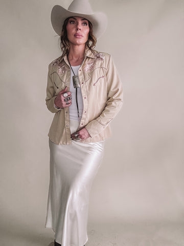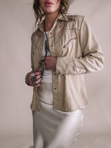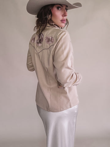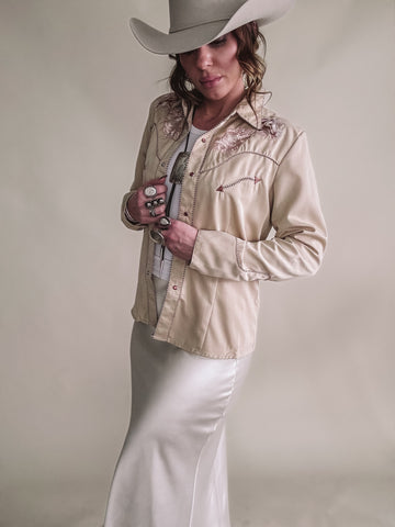 This elegant blouse features a poly/rayon blend with snap front and cuff closures for a comfortable and customizable fit. The embroidered horse and rose design on the front and back yokes add a touch of sophistication. With candy cane piping and two convenient pockets, this machine washable blouse is perfect for any occasion. Imported for quality.