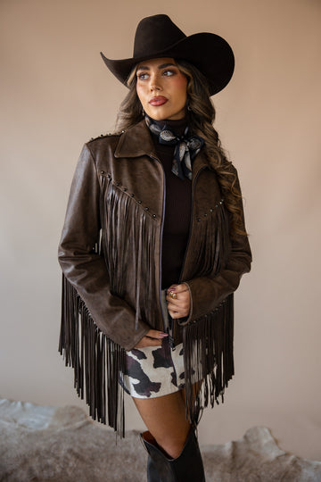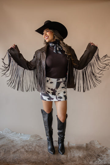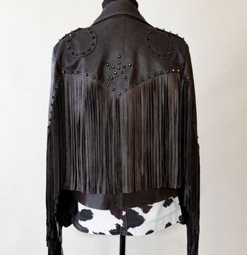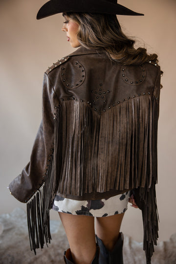 The Stars & Horseshoe Jacket by Dakota West Leathers is cowgirl cool at its finest. Handcrafted from rich chocolate lambskin leather and trimmed with wrist-to-wrist fringe, this artisan-made piece brings western heritage to life. Featuring studded horseshoe patches on the shoulders and a bold star design across the back yoke, it’s a true standout for rodeo nights, styled shoots, or wherever your wild side takes you.