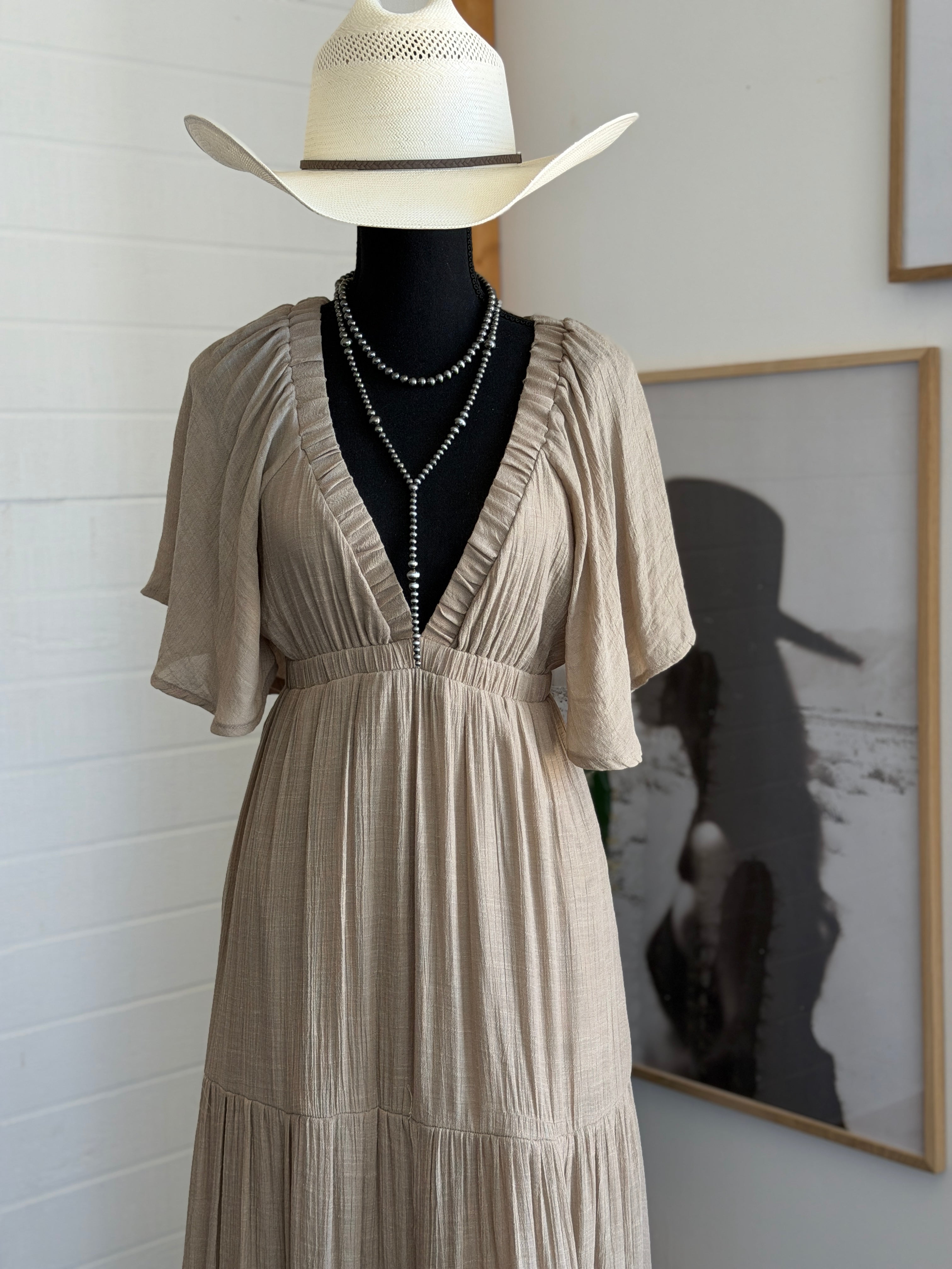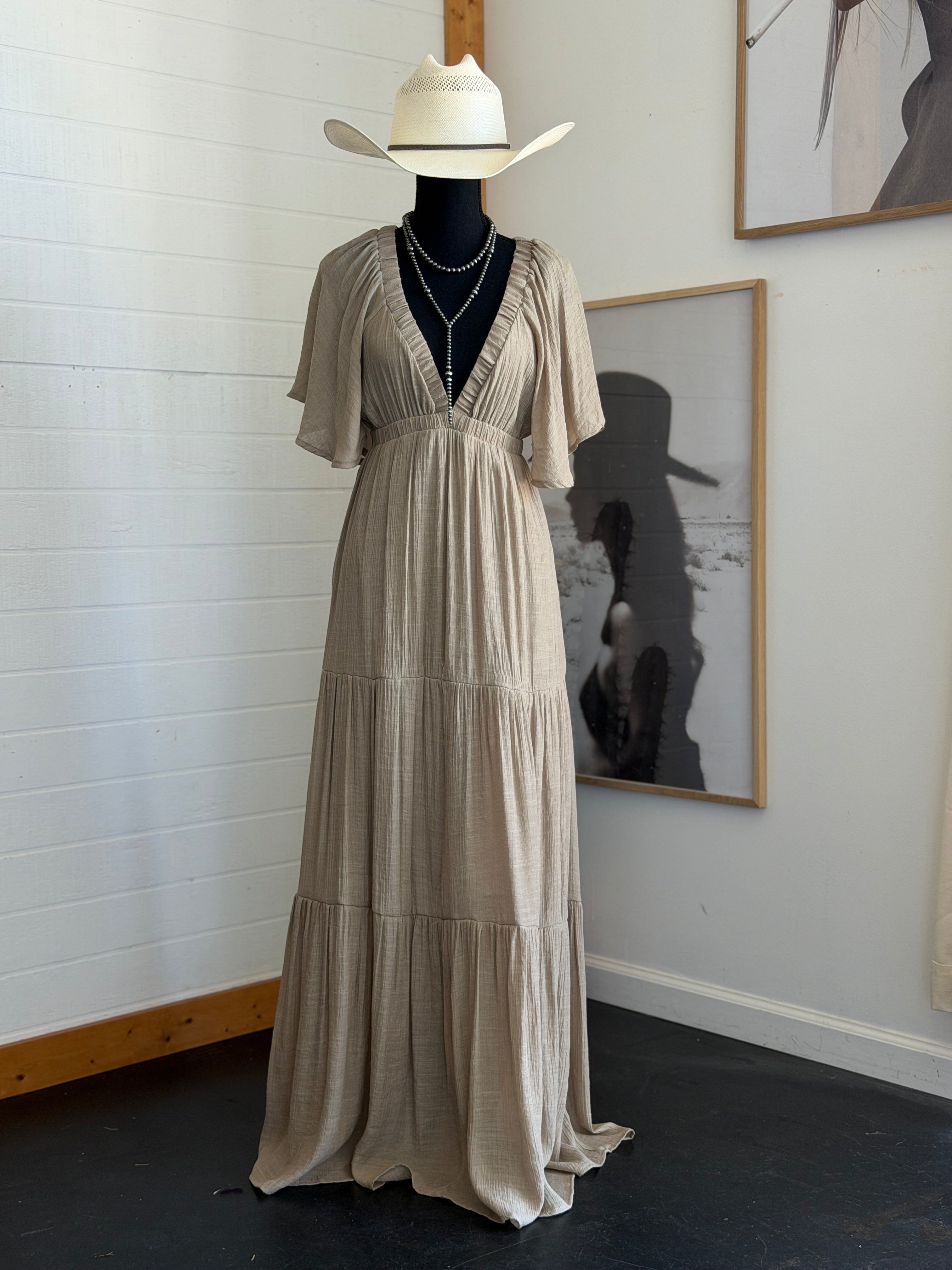 Taupe Flutter Sleeve Tiered Maxi Dress *Pre Order Match 18th*