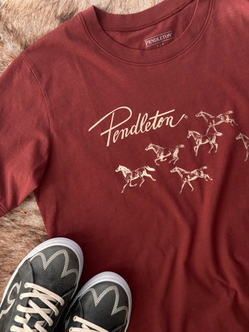 Channel laid-back western vibes with this rust red graphic tee from Pendleton. Featuring a vintage-inspired sketch of running horses and the signature Pendleton logo, this tee is an instant classic for every cowgirl closet.