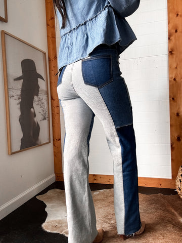 Los jeans rectos de tiro alto con parches son el denim que cualquier atuendo de vaquera necesita. Con control de abdomen para un ajuste suave y favorecedor, y detalles de parches que le dan un toque western audaz, estos jeans son ideales para rodeos, festivales y noches de moda NFR en Las Vegas.