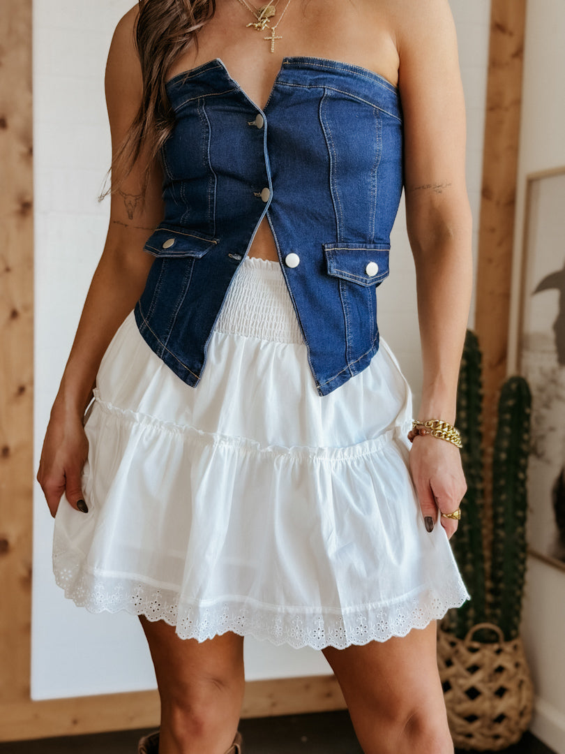 A feminine staple designed for effortless spring and summer styling. This ivory tiered mini skirt features a comfortable smocked waistband and soft layered silhouette finished with delicate eyelet trim. A versatile piece the WILD J  loves paired with denim tops, western boots, or sandals for an easy modern western look.