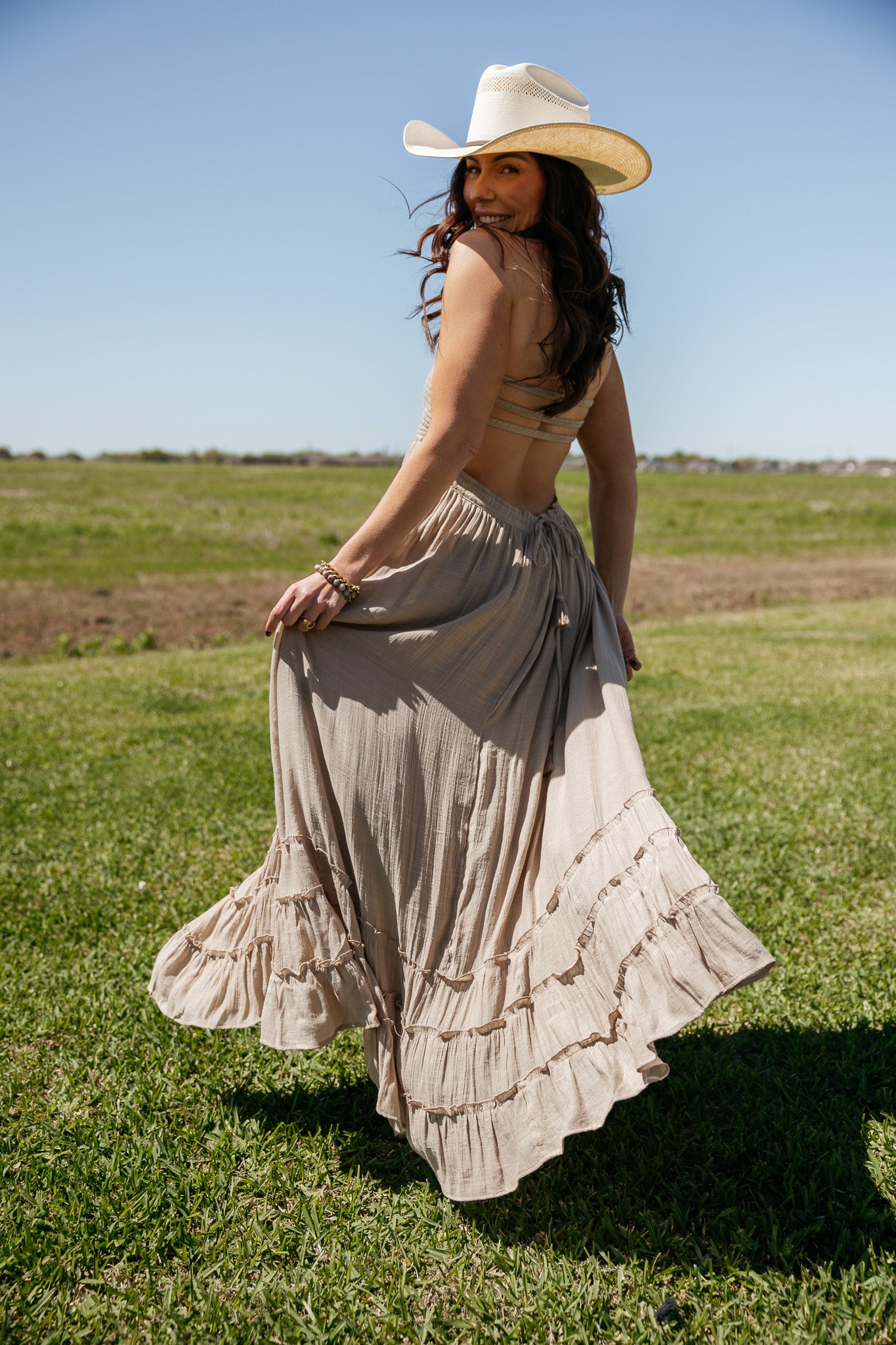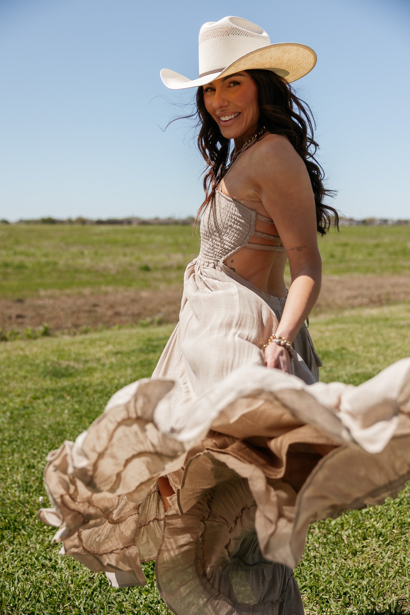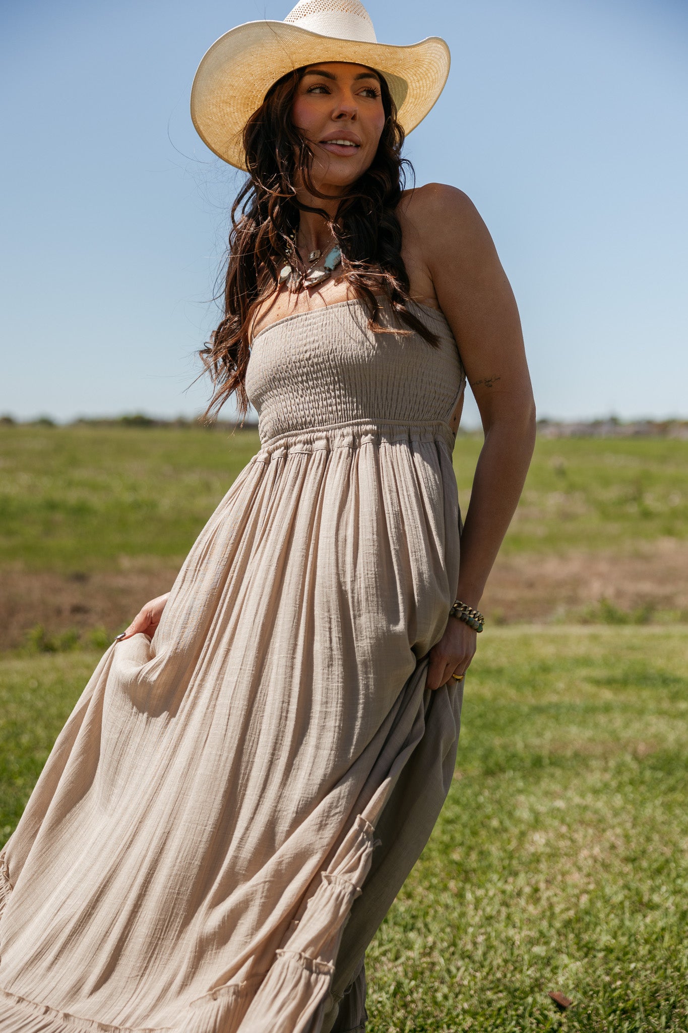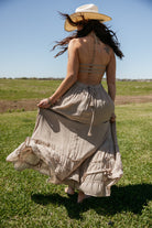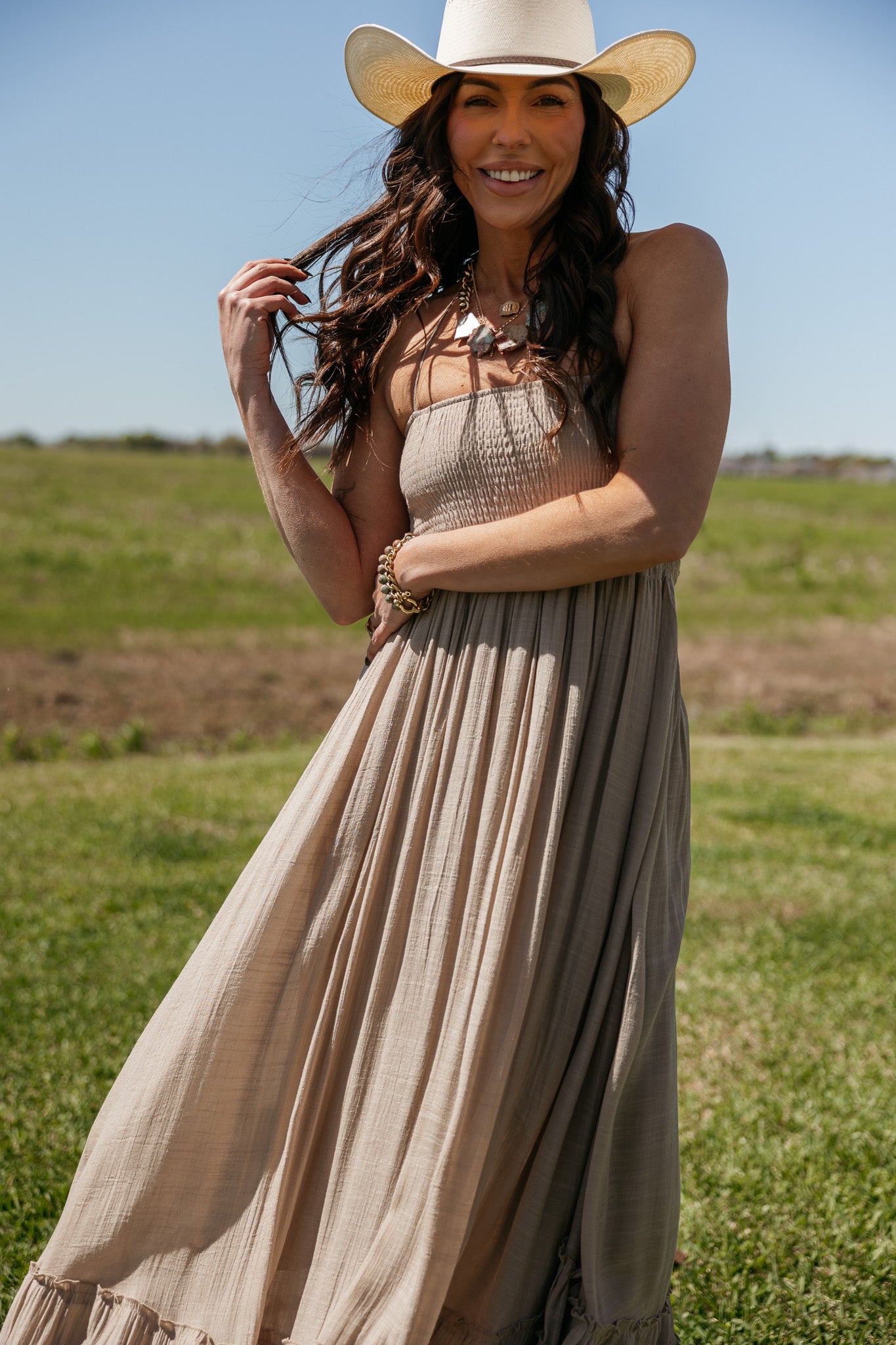 An effortlessly romantic maxi designed for soft movement and modern western styling. This taupe maxi dress features a flattering smocked bodice, halter neckline, and open back with delicate strap details that create an elegant flowing silhouette. A beautiful neutral piece the WILD J  loves for summer events, vacation styling, concerts, and effortless western looks.