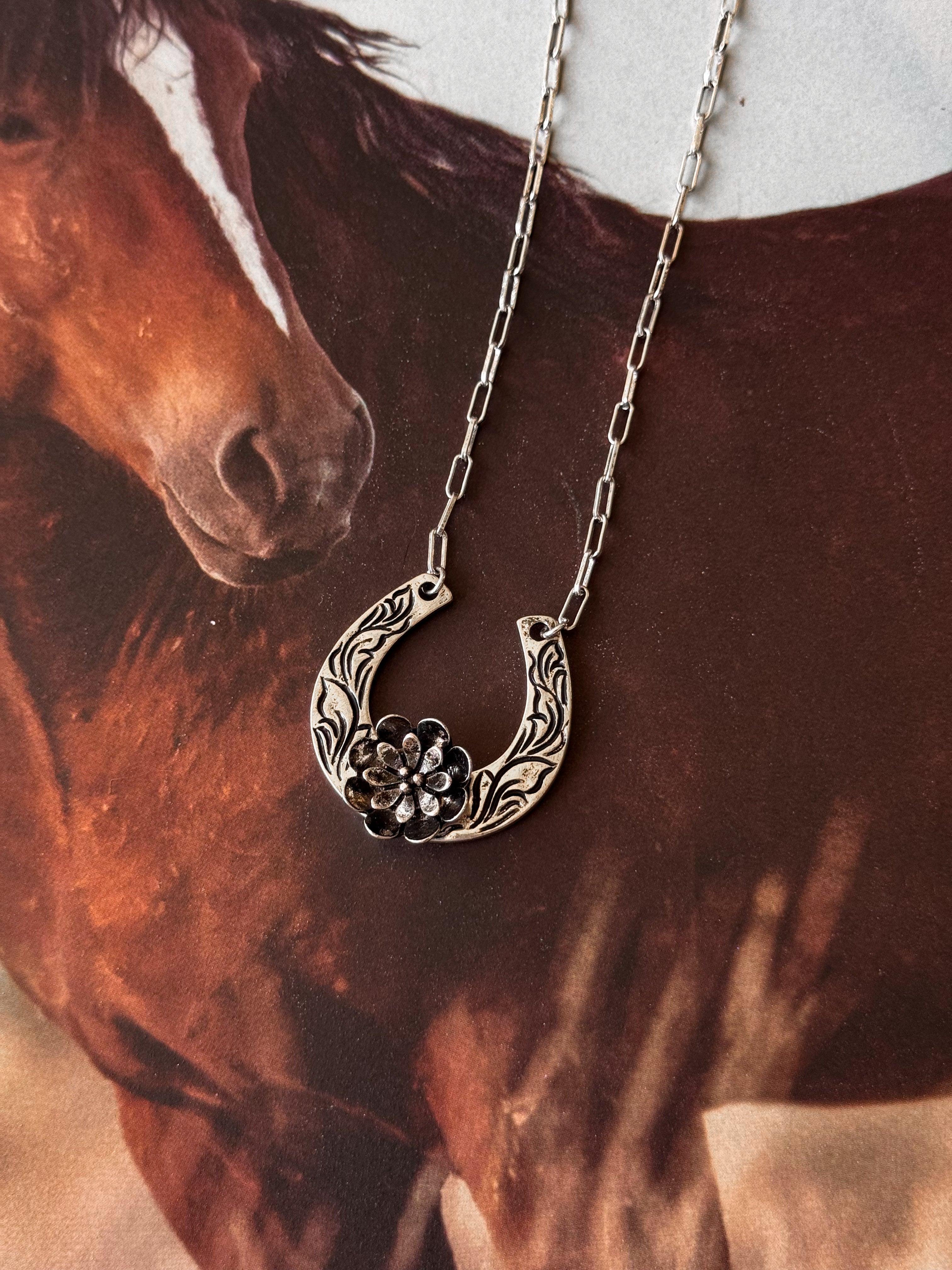 Luck with a little western charm, the Floral Horseshoe Necklace brings soft femininity to a classic cowgirl symbol. Crafted in silver-tone metal, it features a delicately engraved horseshoe accented with a raised floral centerpiece.