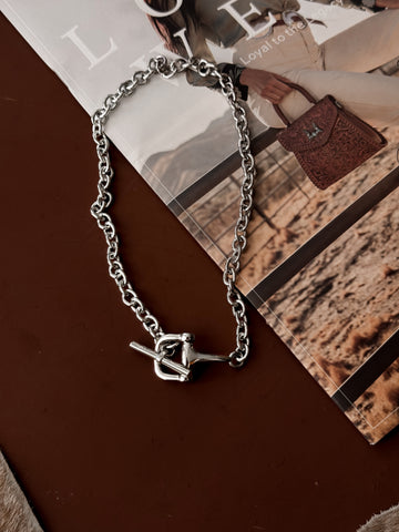 Con un toque de estilo western y un brillo pulido, el collar de palanca Horsebit en plata es una pieza audaz que marca tendencia. Diseñado con gruesos eslabones de bocado y un clásico cierre de palanca, este collar es tan atractivo como atractivo. Su peso es algo elevado, lo que le confiere esa calidad duradera y lujosa que siempre querrás.