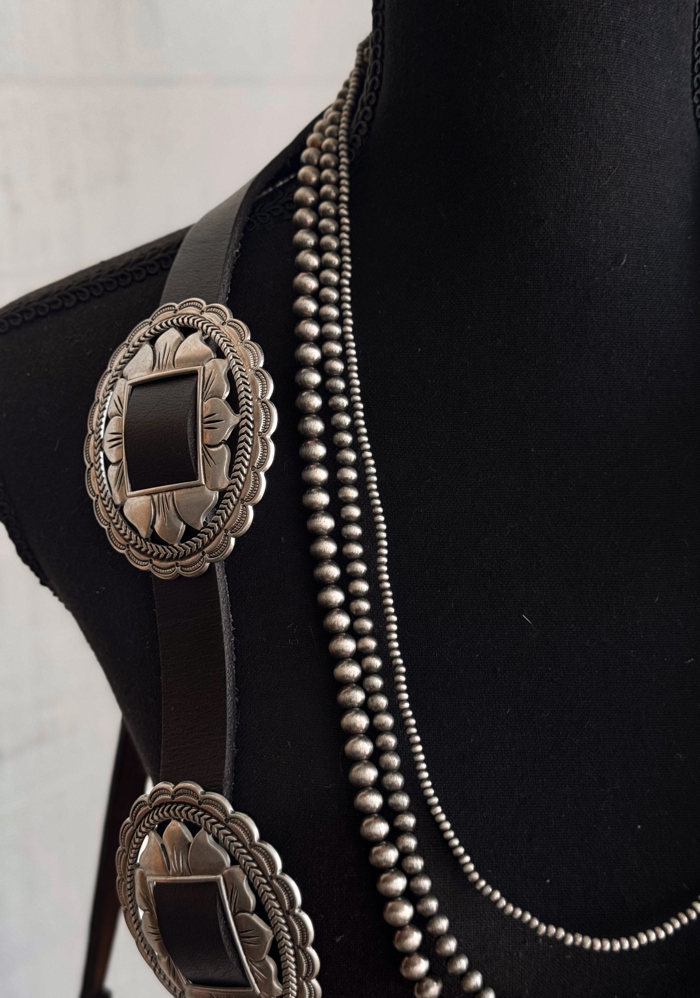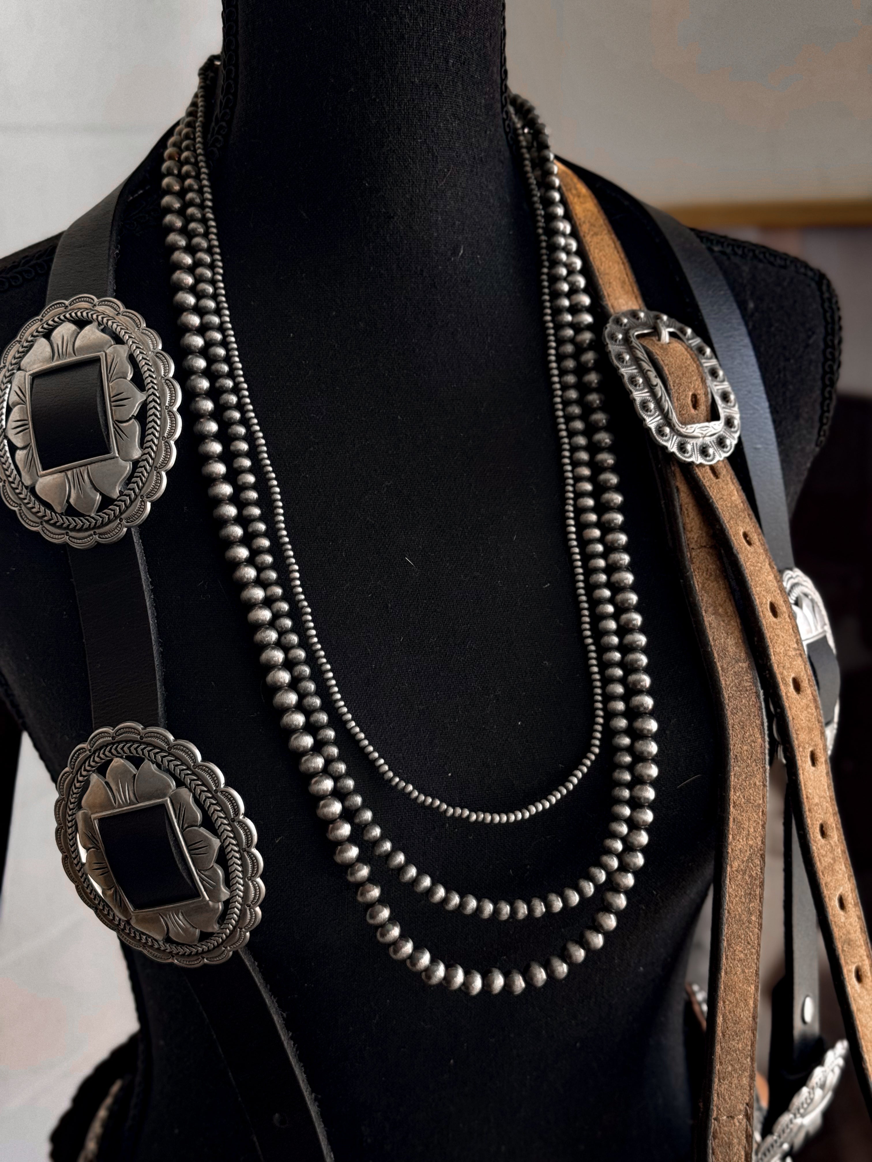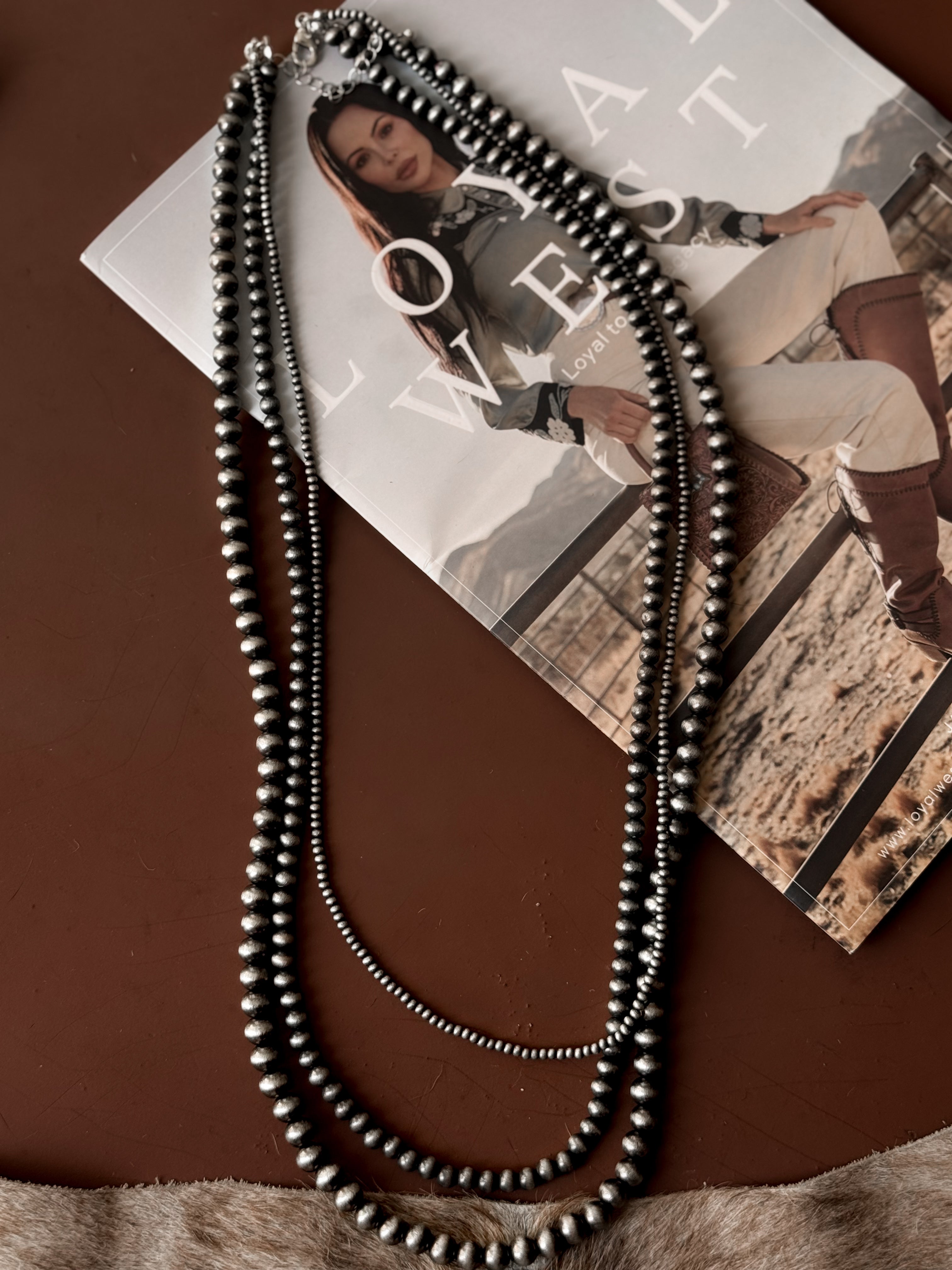 Dale un toque de capas, vaquera. El collar Multi Pearl incluye tres tiras de cuentas de plata bruñida con longitudes perfectamente escalonadas (73, 78 y 84 cm + extensor de 7,6 cm). Diseñado para ese look clásico de inspiración navajo, es tan audaz que puede lucirse solo, pero también se puede combinar con turquesas o conchos. Ya sea para ir a un rodeo o simplemente para darle un toque especial a tus vaqueros, este es el accesorio que siempre querrás.
