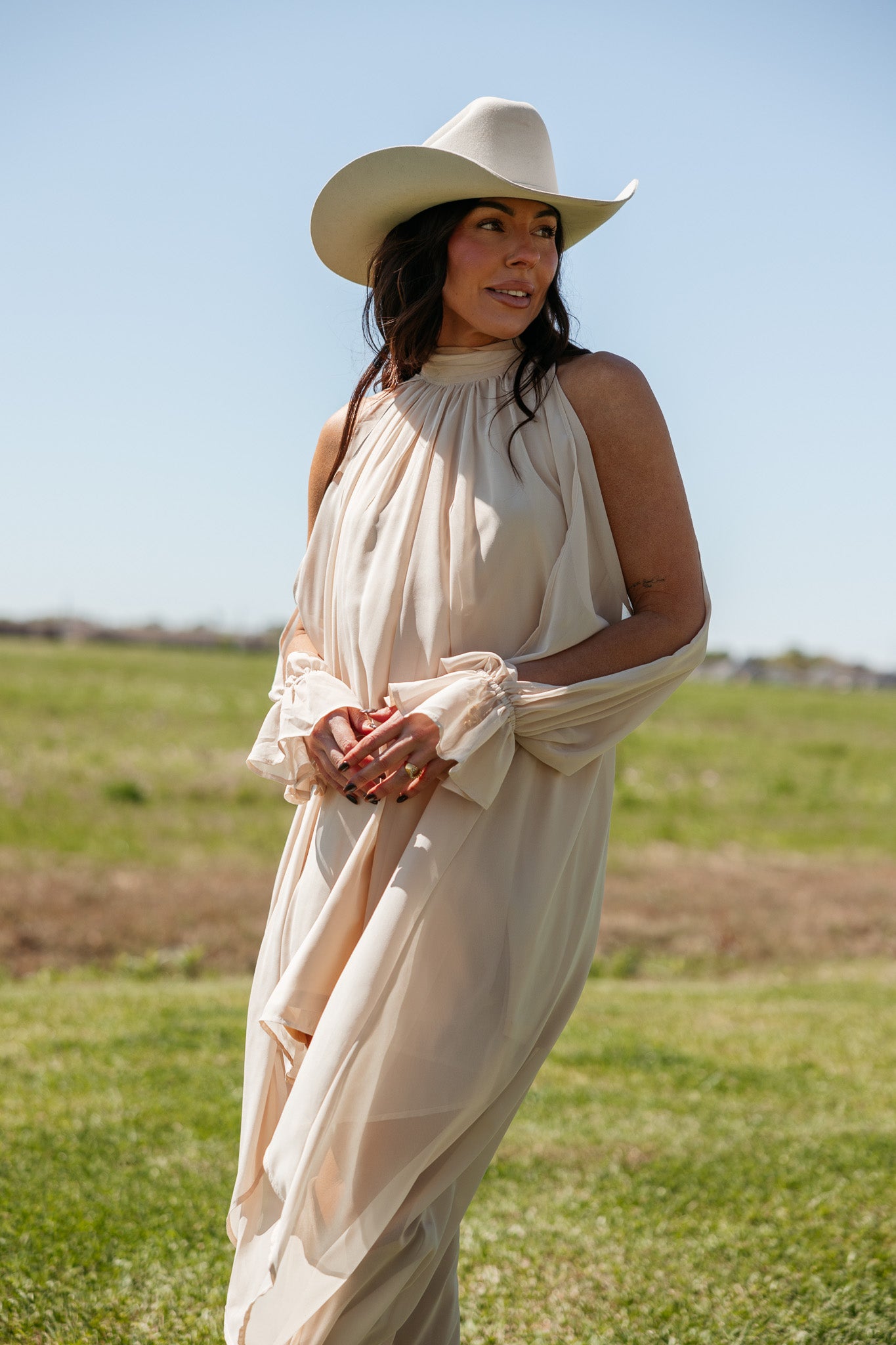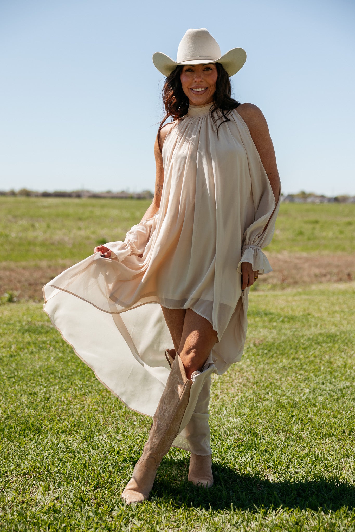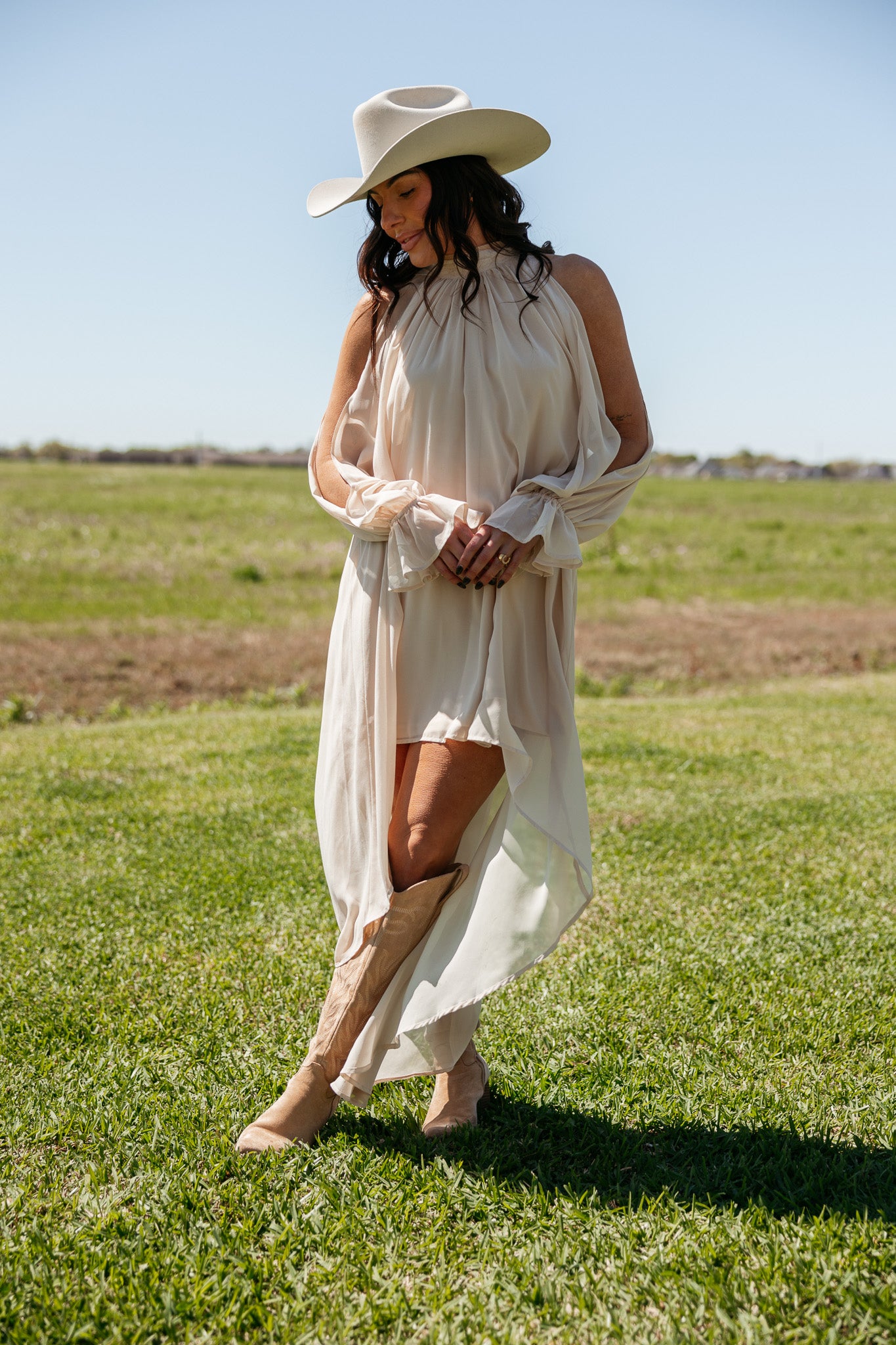 This champagne dress features a softly gathered neckline and a fluid high-low hem, creating effortless movement for western-chic outfits and elevated day-to-night styling.