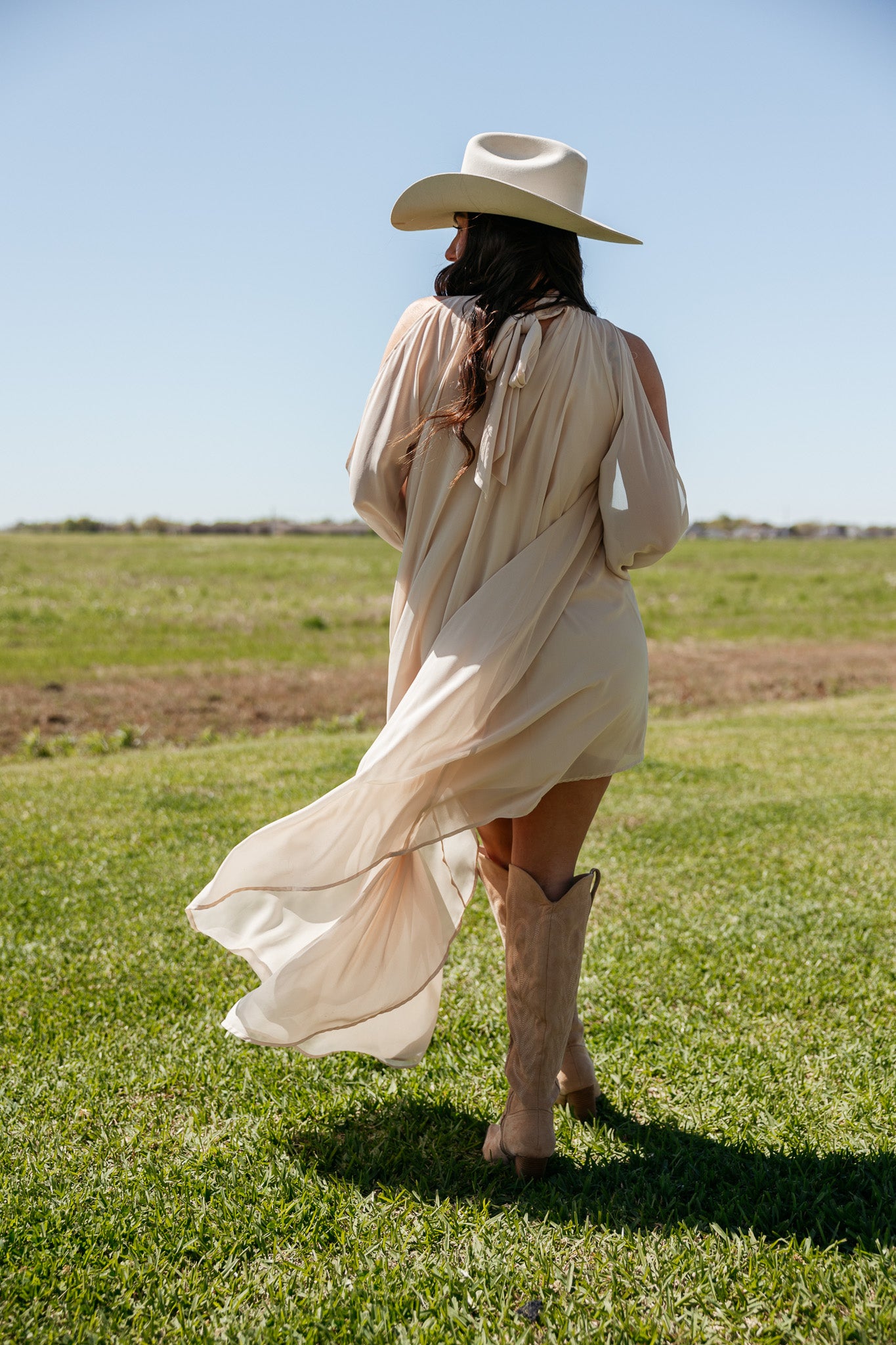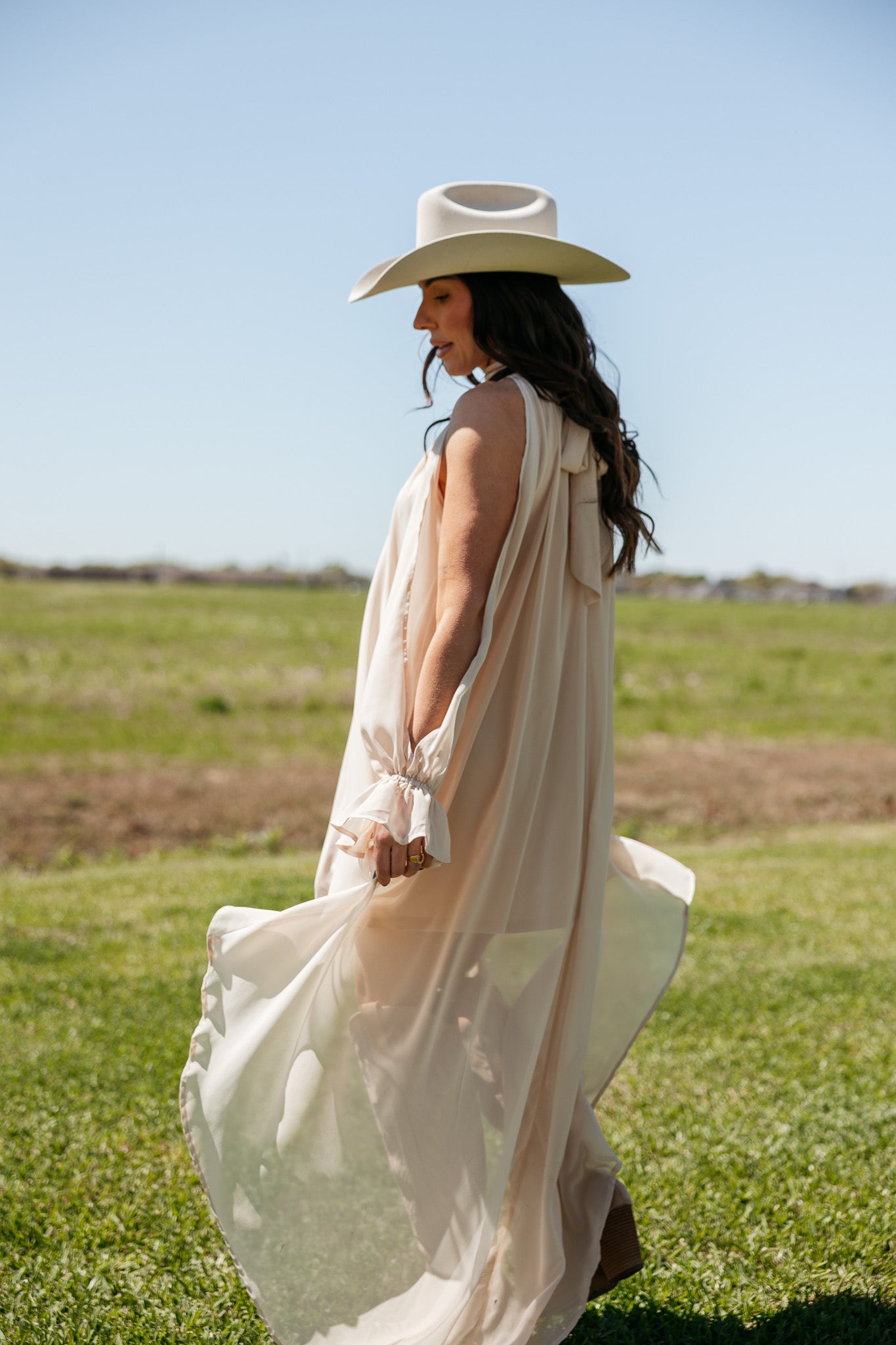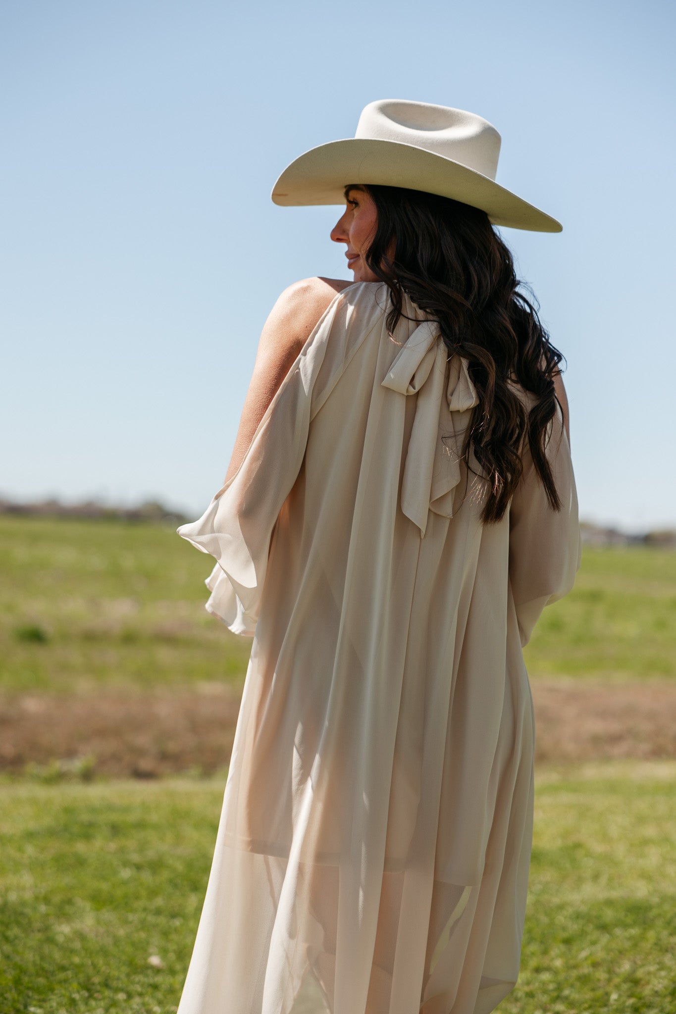 This champagne dress features a softly gathered neckline and a fluid high-low hem, creating effortless movement for western-chic outfits and elevated day-to-night styling.
