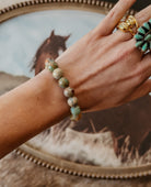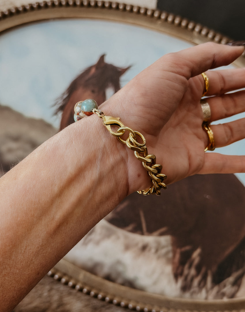 Elevate your everyday style with this striking Snakeskin Jasper bracelet. Featuring 10mm natural stones with earthy, mesmerizing patterns, each bead tells its own story. Strung on a solid brass curb chain that resists tarnishing, this piece combines durability with timeless elegance. The warm gold tones complement the rich earth hues of the jasper, creating a balanced, sophisticated look that works for any occasion.