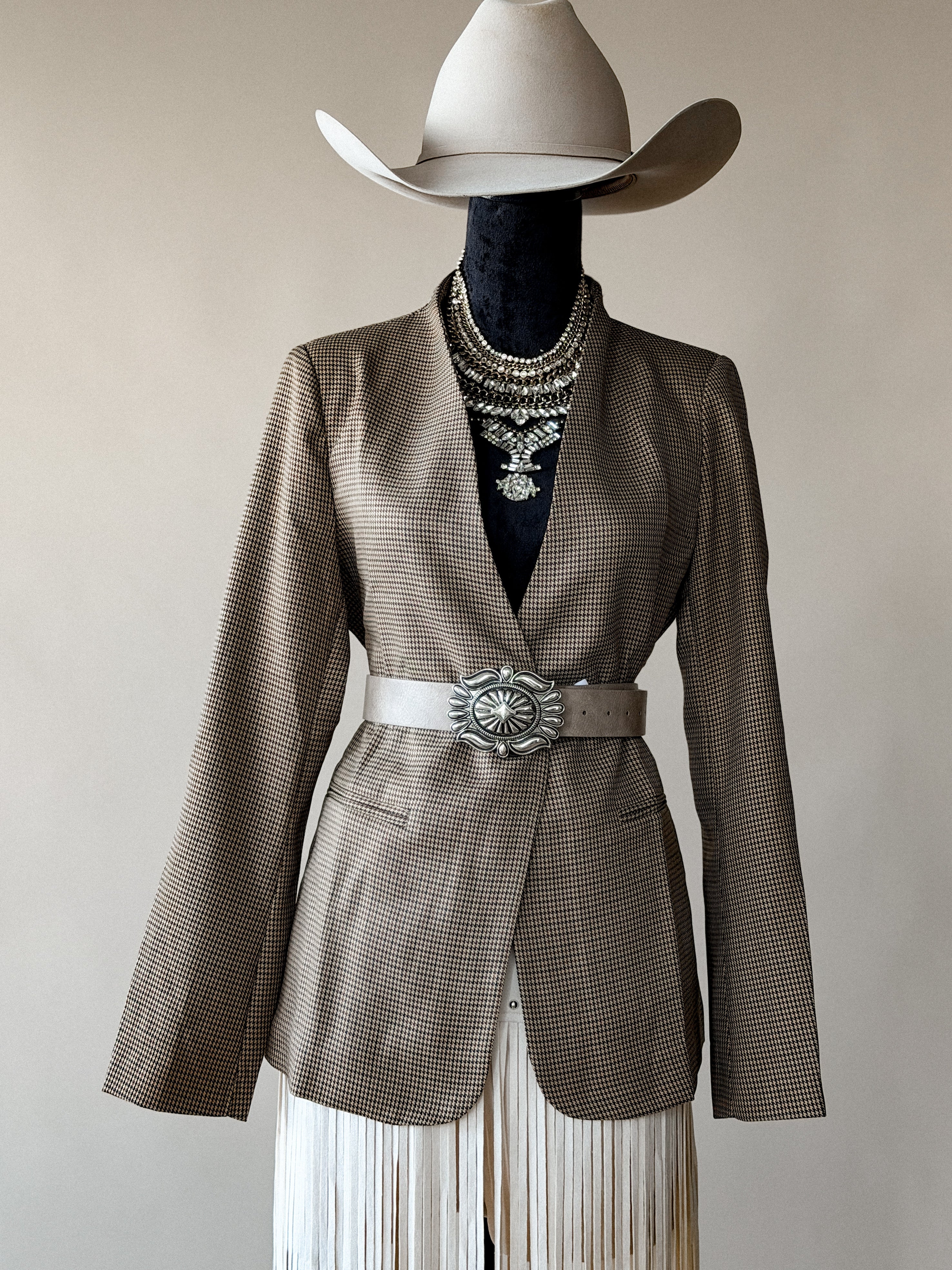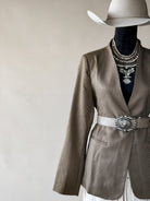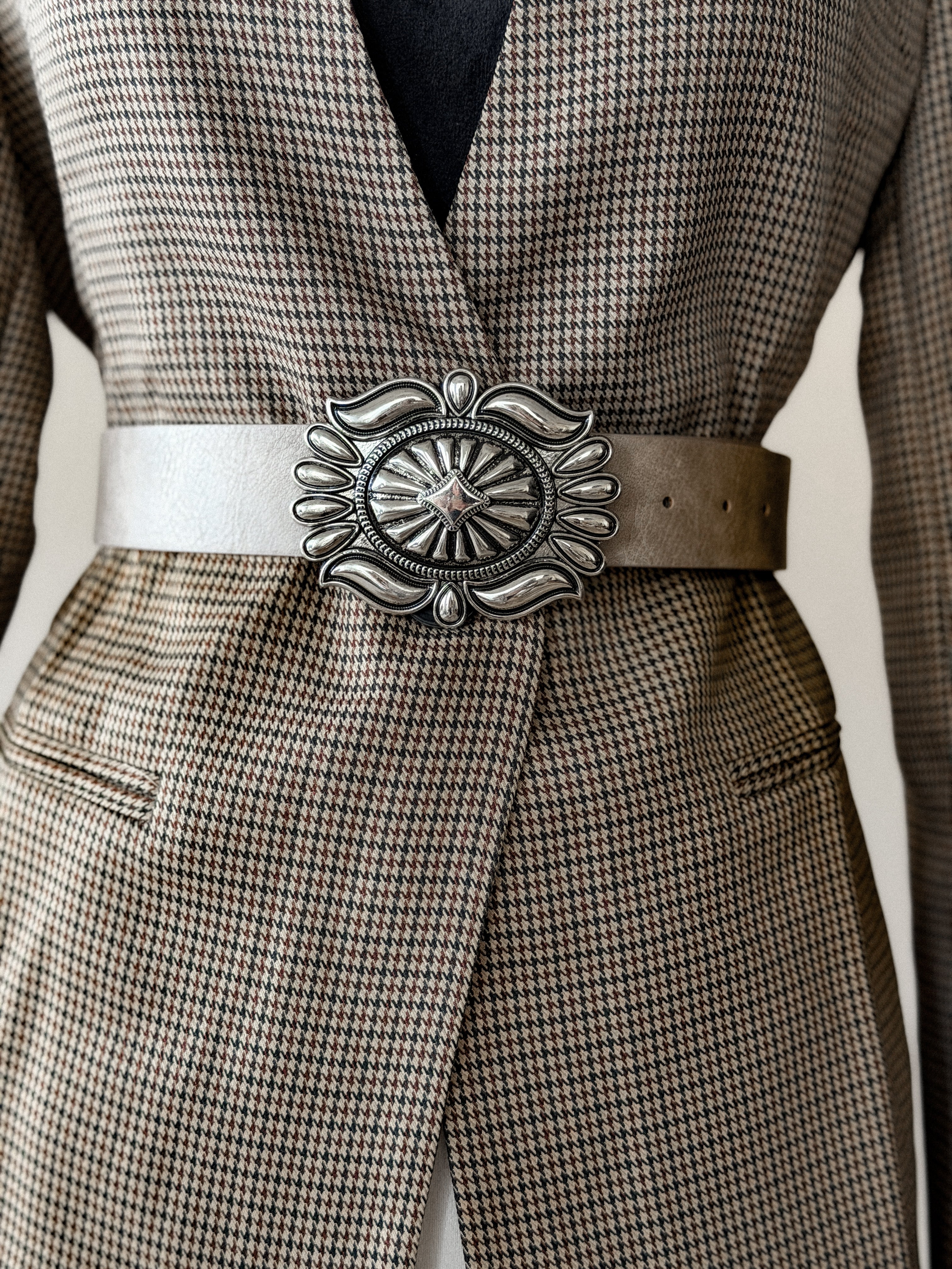 Designed with a smooth silver/beige faux-leather strap and an ornate silver-tone floral buckle, this belt blends feminine detailing with classic western grit. Easy to dress up or down, it works cinched at the waist over a dress or threaded through your favorite denim when you want that effortless, cool-girl cowgirl look.