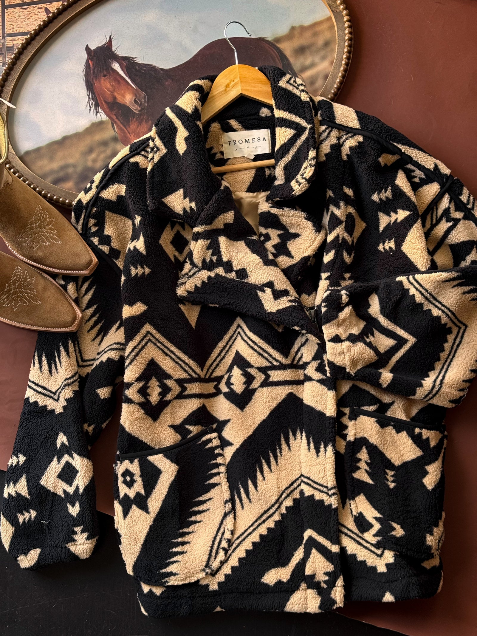 The Geo-Print Sherpa Fleece Zip-Up in black brings bold western patterning and cozy texture together. Featuring soft sherpa fleece with contrasting piping and an oversized lapel collar, this jacket nails that mix of rugged warmth and effortless style. Perfect for NFR nights, chilly rodeo mornings, or casual layering over denim and boots.