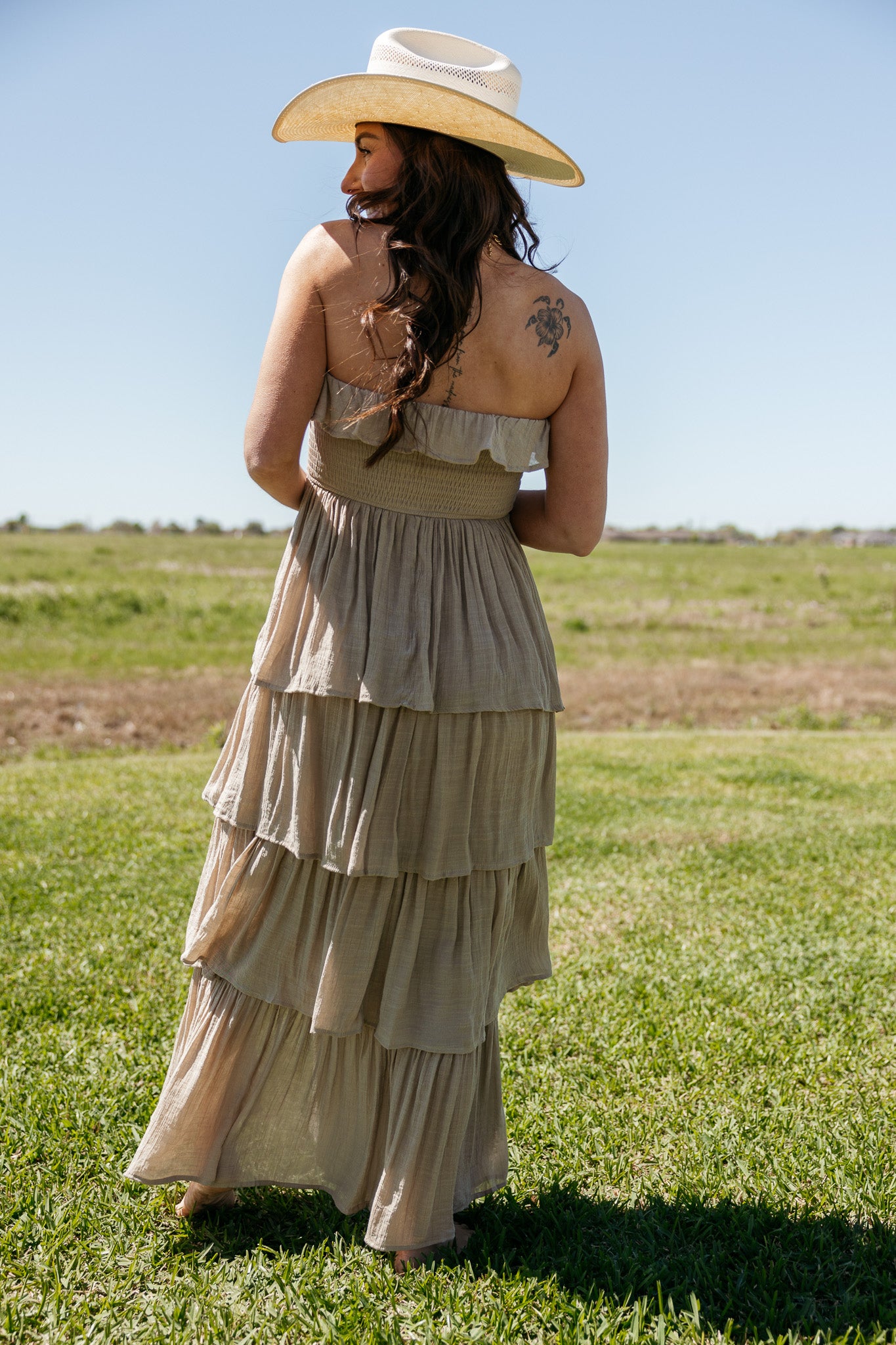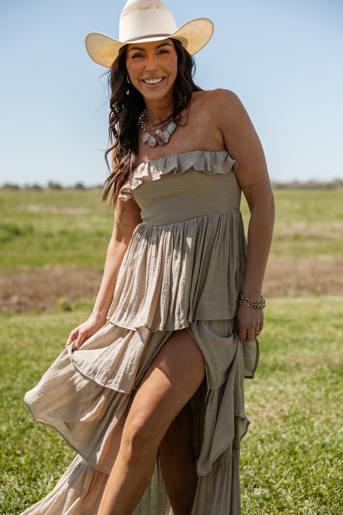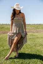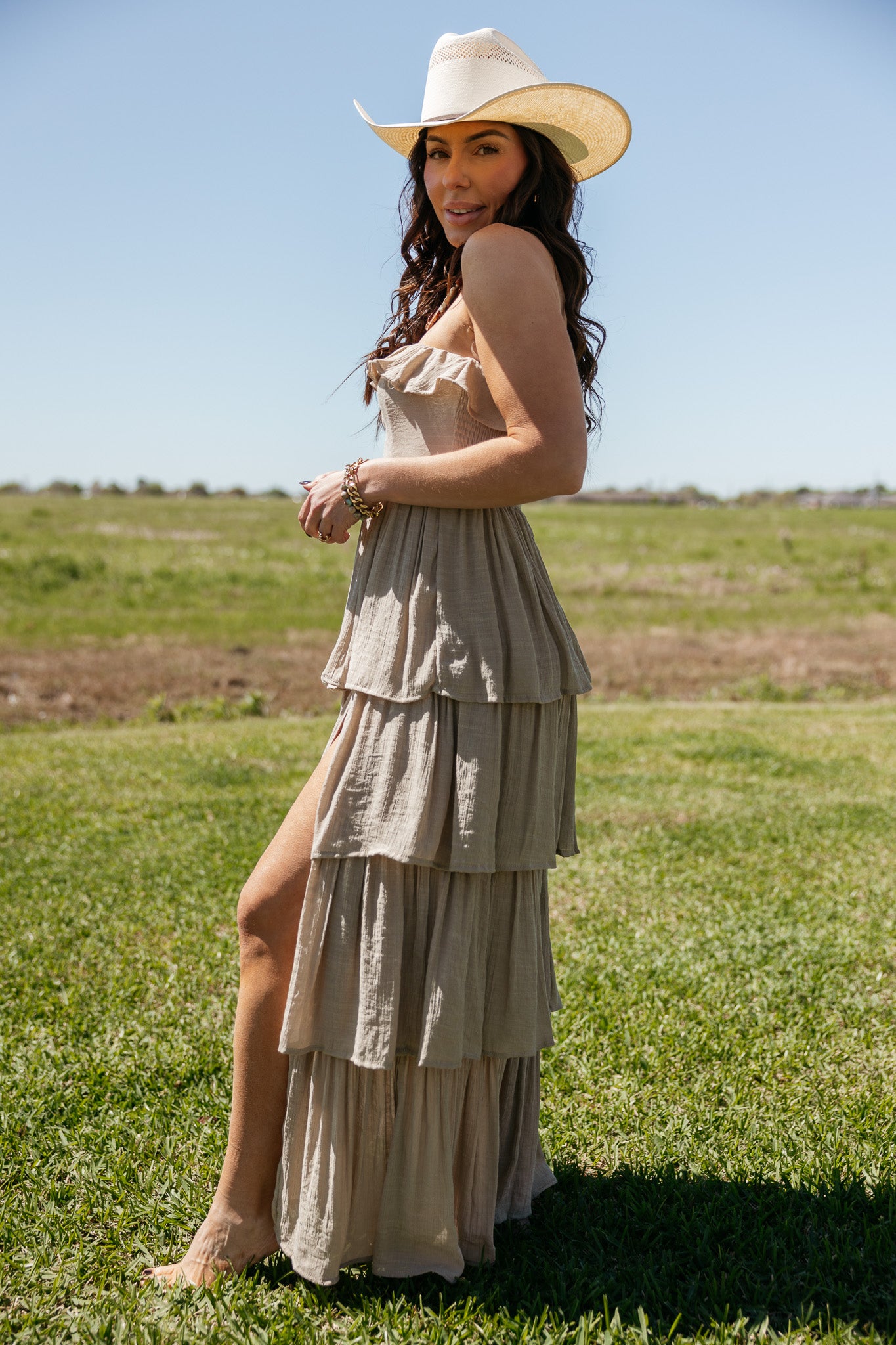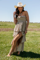 An effortless statement dress with soft movement and romantic texture. This strapless tiered maxi dress features a flattering smocked bodice and cascading layers that create a beautiful flowing silhouette. A timeless piece the WILD J loves for summer events, vacation nights, and effortless western-inspired styling.