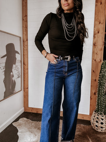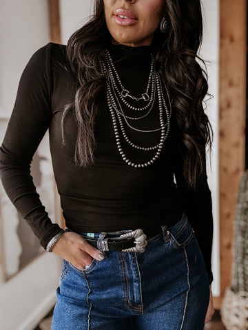El jersey de cuello alto de manga larga acanalado es una prenda imprescindible para cualquier temporada. Con su textura de microcanalé y su favorecedor corte a la cadera, es la base perfecta para conjuntos de rodeo, estilo western de Las Vegas o para festivales. Ya sea por dentro de una prenda vaquera o debajo de una chaqueta con flecos, este básico del western hace que cualquier atuendo de vaquera luzca elegante y sin esfuerzo.