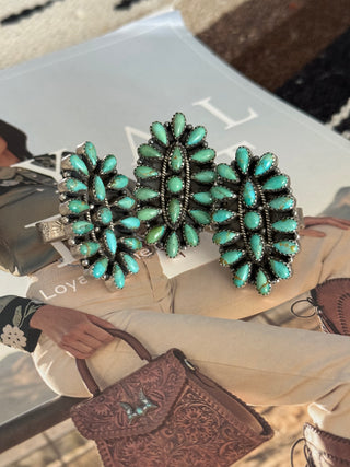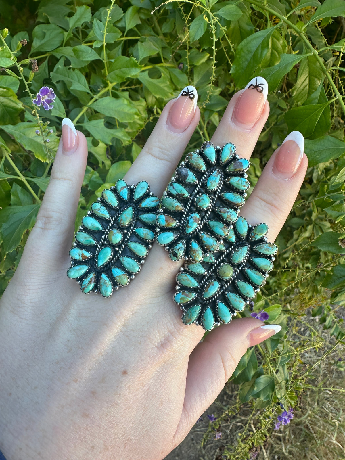 El tipo de anillo que acapara todas las miradas sin proponérselo. El anillo ajustable Silverton Kingman está hecho a mano con una piedra natural de turquesa Kingman, engastada con un minucioso trabajo artesanal en plata de ley con un toque de alma occidental. Con 5 cm de largo x 2,5 cm de ancho, es audaz pero llevable, y gracias a su banda ajustable, puedes lucirlo en cualquier dedo. Firmado por Nizhoni y con sello Sterling , cada pieza es tan única como la piedra que lleva.