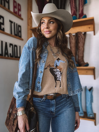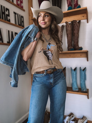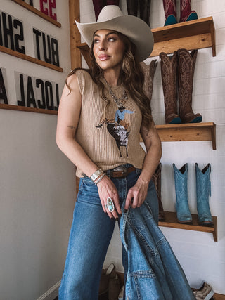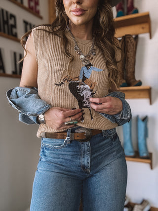 El suéter sin mangas Bull Rider encarna la auténtica herencia del Oeste con su detallada representación tejida de un vaquero sobre un toro salvaje. Confeccionada en un rico punto color canela, esta prenda aporta profundidad y resonancia cultural a cualquier conjunto. Su diseño versátil combina a la perfección con pantalones acampanados o shorts vaqueros, convirtiéndola en una prenda emblemática para los amantes de la moda del Oeste más exigentes.