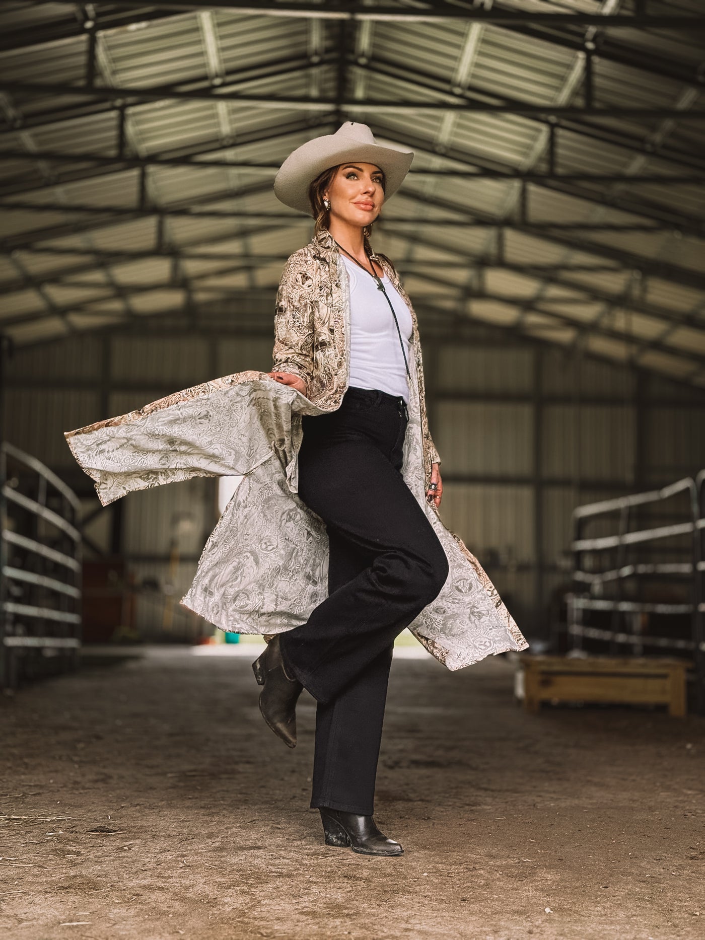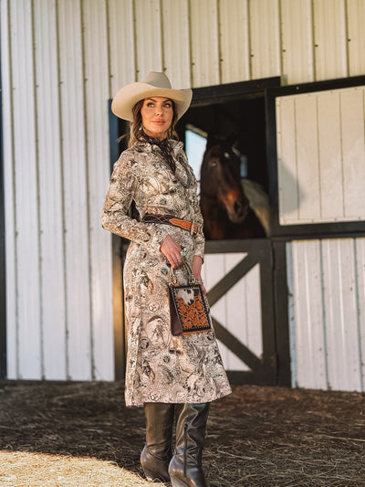 Las botas pueden ser la clave, pero este vestido habla por sí solo. El sueño de cualquier fashionista occidental, adornado con hermosos botones de presión de perla en toda la parte delantera, aberturas laterales y, por supuesto, bolsillos. Un diseño atemporal que marca tendencia con comodidad y estilo.