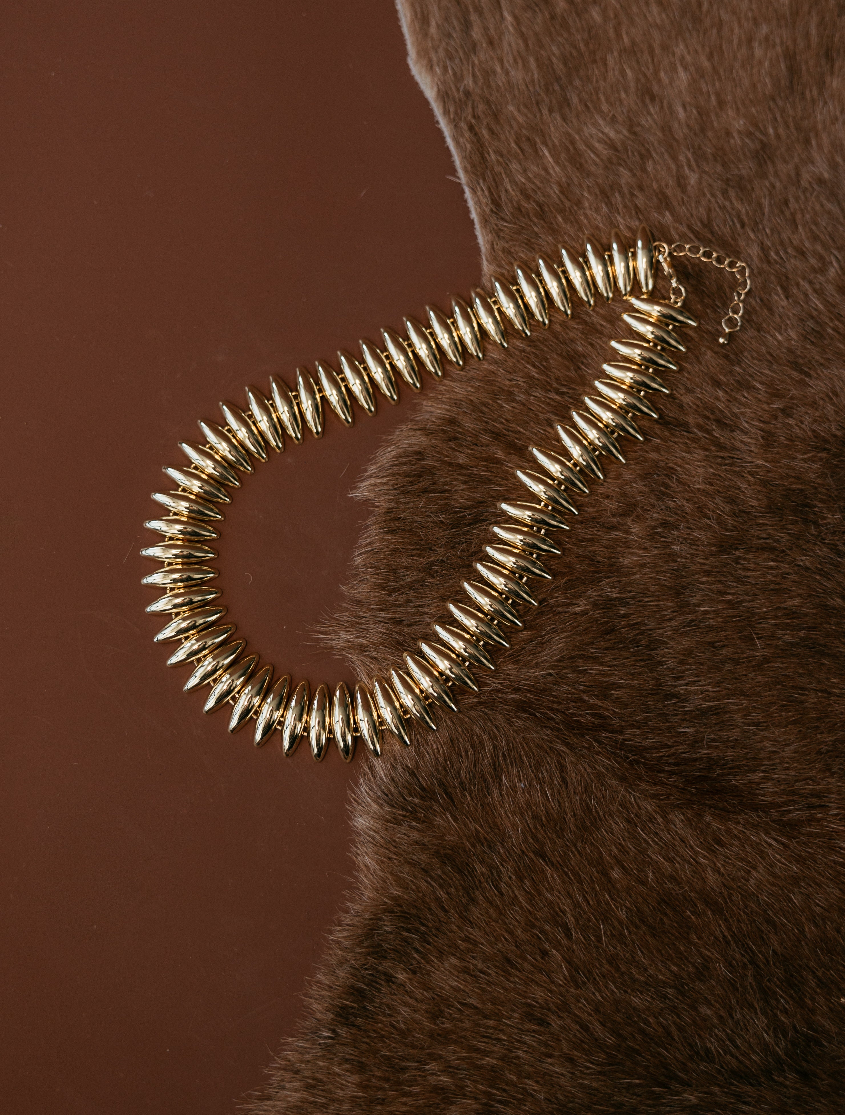 Meet your new statement piece. The Horse Eye Spike Necklace is a lightweight, sculptural design crafted in 18K gold-plated stainless steel. Each polished spike catches the light beautifully, giving this piece a bold, runway-inspired look without the heavy feel of traditional metal chokers.