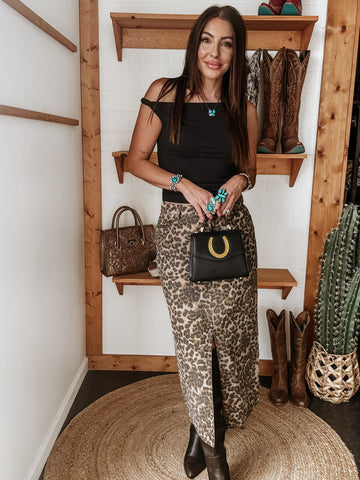 Unleash your wild side in this denim leopard print midi skirt. Designed in a flattering pencil silhouette with a bold animal print, this skirt hugs you in all the right places while offering comfort and stretch. The front slit adds just the right amount of movement, making it easy to dress up with heels or down with boots. Made from a soft cotton blend, it’s structured yet flexible—perfect for your next western night out or statement everyday look.