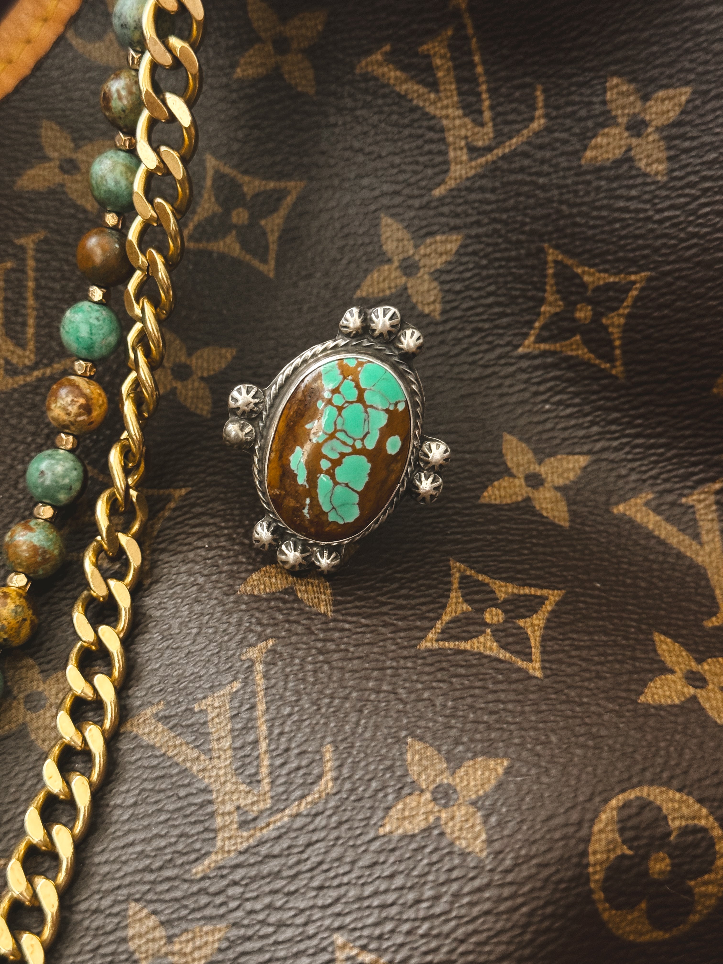 This striking ring is a signed work by Navajo silversmith Sheila Tso, renowned for her dramatic turquoise and sterling silver creations. The centerpiece showcases a large natural turquoise stone with rich blue-green hues and golden brown matrix, set in a hand-cut sterling silver bezel. Surrounding the stone are traditional Navajo silver accents, giving the ring depth and texture.