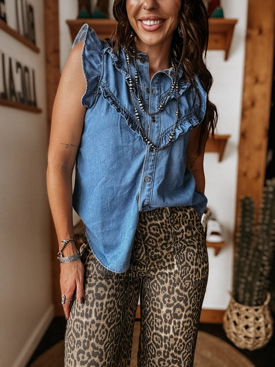 This sleeveless ruffle denim blouse is giving classic cowgirl charm with a feminine twist. Crafted in a soft, breathable denim blend, it features a button-up front, gentle ruffle details, and a western-style yoke that brings subtle structure to the silhouette.