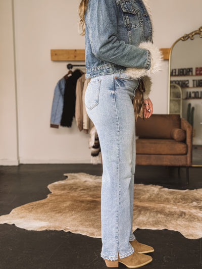 Looking for your next denim obsession? The Super High-Rise Light Wash Jeans are made for the modern cowgirl who craves structure, comfort, and a little edge. Designed in a light wash western denim with a flattering 12” rise and subtle slit detail, these jeans sculpt your waist while keeping your outfit effortlessly chill.
