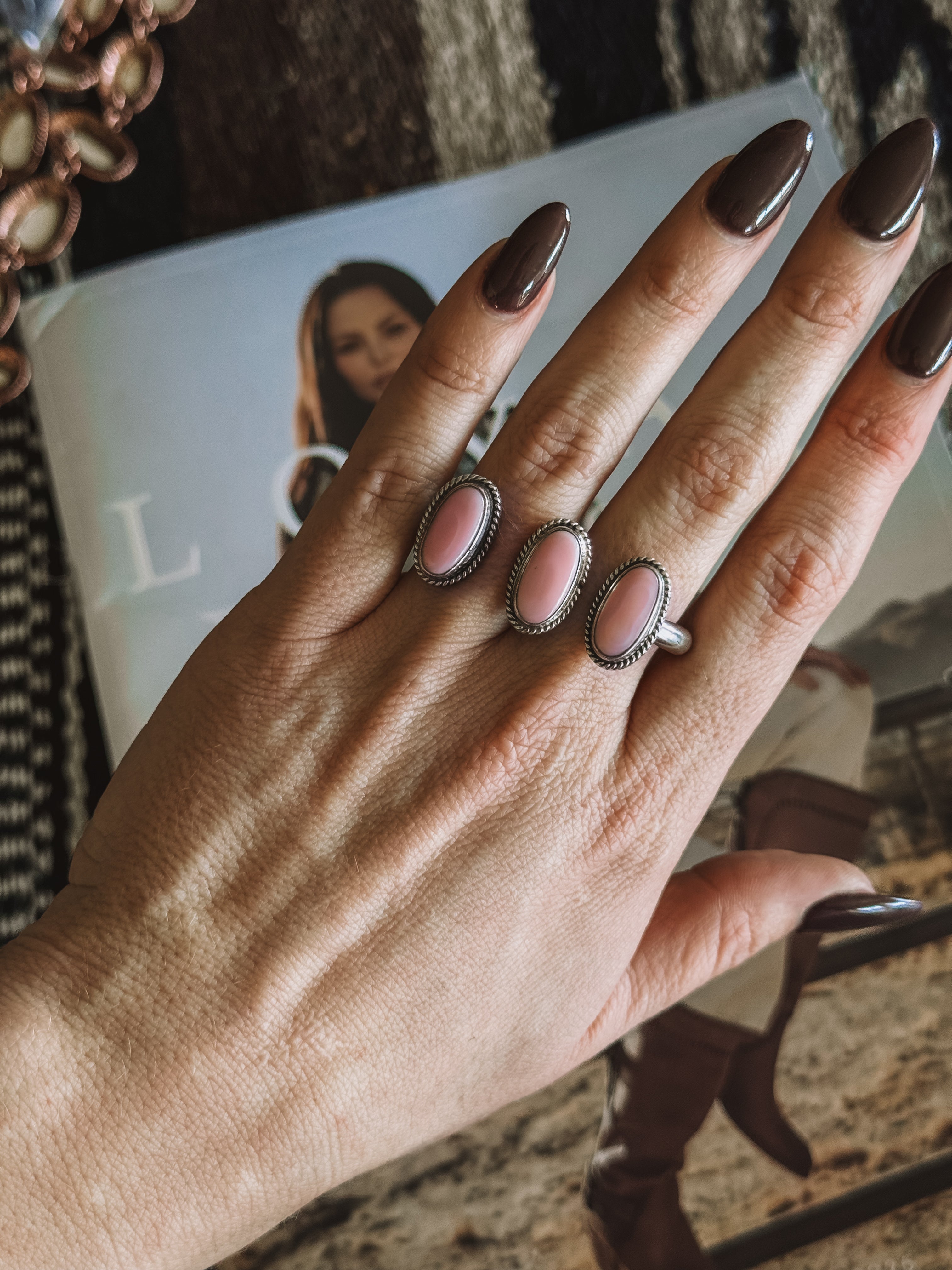 You’ve seen turquoise, but have you met her softer, blush-toned sister? This Pink Conch statement ring (sometimes searched as “pink turquoise”) is a rare western treasure. Three glossy stones stretch across two fingers, glowing against a hand-twisted sterling silver rope design. Handcrafted by Navajo artisans and adjustable for comfort, it’s a bold yet tender piece — perfect for cowgirls with a softer side.