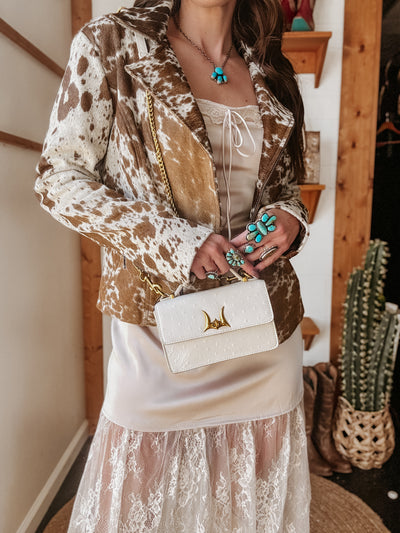 Meet the Valencia Ostrich Leather Bag – where rugged charm meets high-end detail. This crisp white mini purse is crafted from premium ostrich-textured leather with a structured silhouette, soft suede lining, and built-in card slots for easy organization. The standout? A signature gold longhorn clasp and gleaming chain strap for a touch of cowgirl glam.