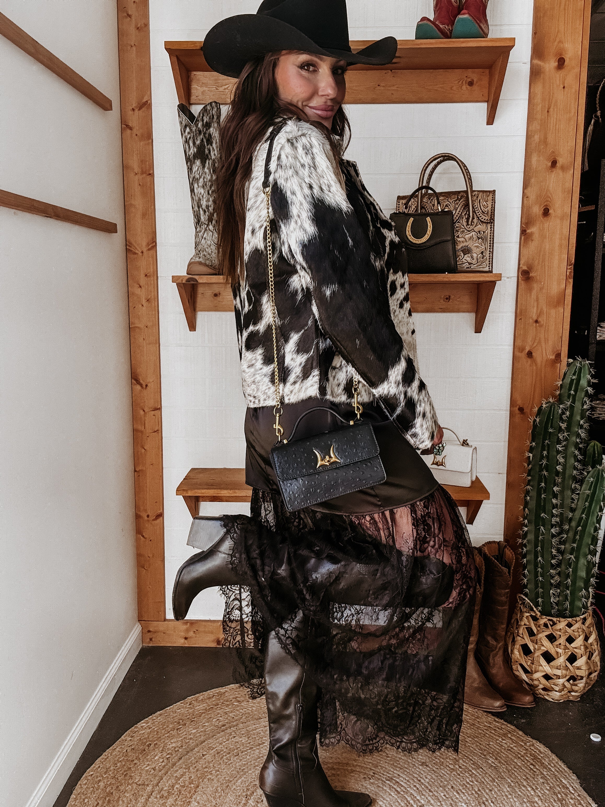 Este é para as ousadas. O vestido longo preto de renda e cetim combina o estilo western elegante com uma vibe sensual e sofisticada. Confeccionado com um corpete de cetim brilhante, parte inferior de renda transparente e um delicado laço no busto, este vestido traz atitude séria, mantendo a feminilidade. Combine-o com acessórios turquesa, concho ou sua jaqueta de couro favorita para um glamour despojado e casual.