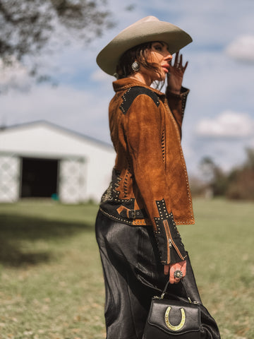 Apresentamos a nossa Jaqueta Scully com Tachas - uma combinação cativante de camurça marrom e preta, com detalhes intrincados de tachas nas mangas, ombros e costas. Com um design deslumbrante nas costas que adiciona um toque ousado, esta jaqueta oferece um visual versátil e ousado para qualquer ocasião. Aprimore seu estilo com esta peça dinâmica e cheia de estilo.