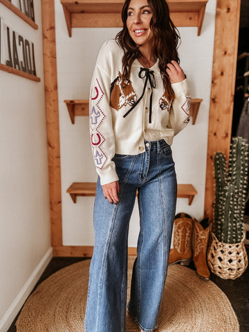 Esta calça jeans de perna larga em denim macio foi feita para ser elegante. Com cintura alta e costuras que modelam o bumbum, ela se ajusta perfeitamente aos seus pés, proporcionando aquele ar moderno e descontraído do estilo western. A costura frontal alonga a perna, enquanto a silhueta larga adiciona um toque retrô e descolado. Feita com uma mistura de jeans macia e sem restrições que mantém o formato — perfeita para looks mais formais ou informais.