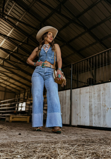 O jeans com lavagem clara confere aquele toque cowgirl, enquanto a cintura alta estruturada valoriza a cintura e alonga as pernas. Este é o jeans que você veste quando quer um visual estiloso e despojado — seja para ir à feira, assistir a um espetáculo ou simplesmente se sentir usando botas.