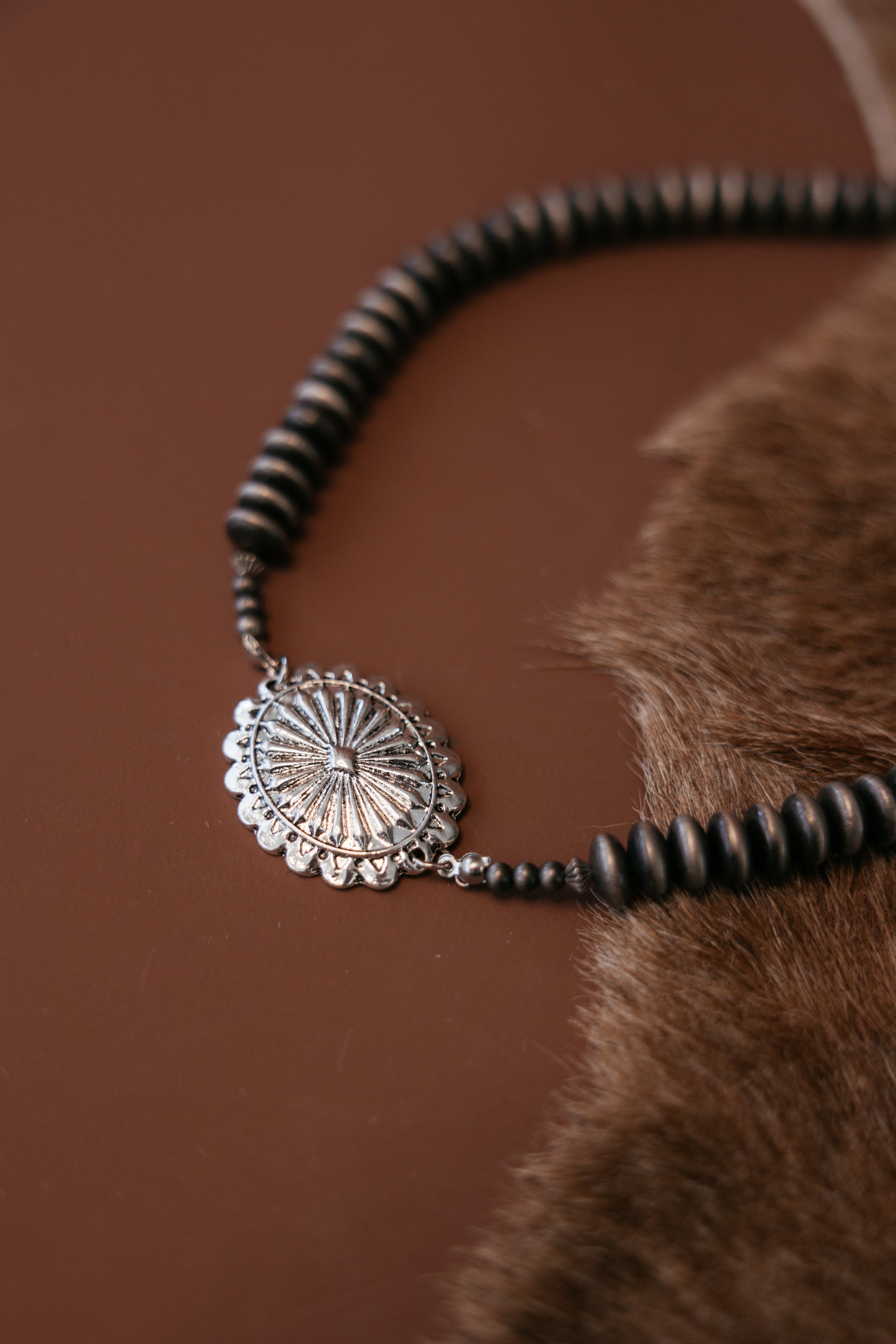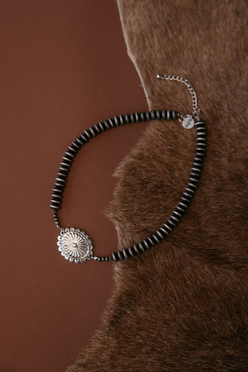 A bold western statement with a touch of edge. The Concho & Disc Choker features classic engraved concho detailing paired with a modern disc pendant, creating a striking blend of heritage and contemporary style. Its structured choker fit sits high on the neckline, making it the perfect finishing piece for graphic tees, blazers, dresses, and rodeo-ready looks.