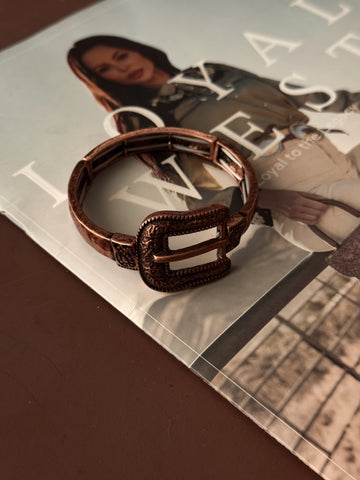 Cowgirl, conheça sua nova pulseira de destaque. Esta pulseira com fivela de cinto estilo Western tem todo o charme do rodeio sem complicações — um design detalhado com fivela de cobre que se estica para um ajuste fácil e confortável. Seja combinando com pulseiras de prata ou deixando-a brilhar sozinha, esta belezura polida traz a mistura perfeita de ousadia e glamour.