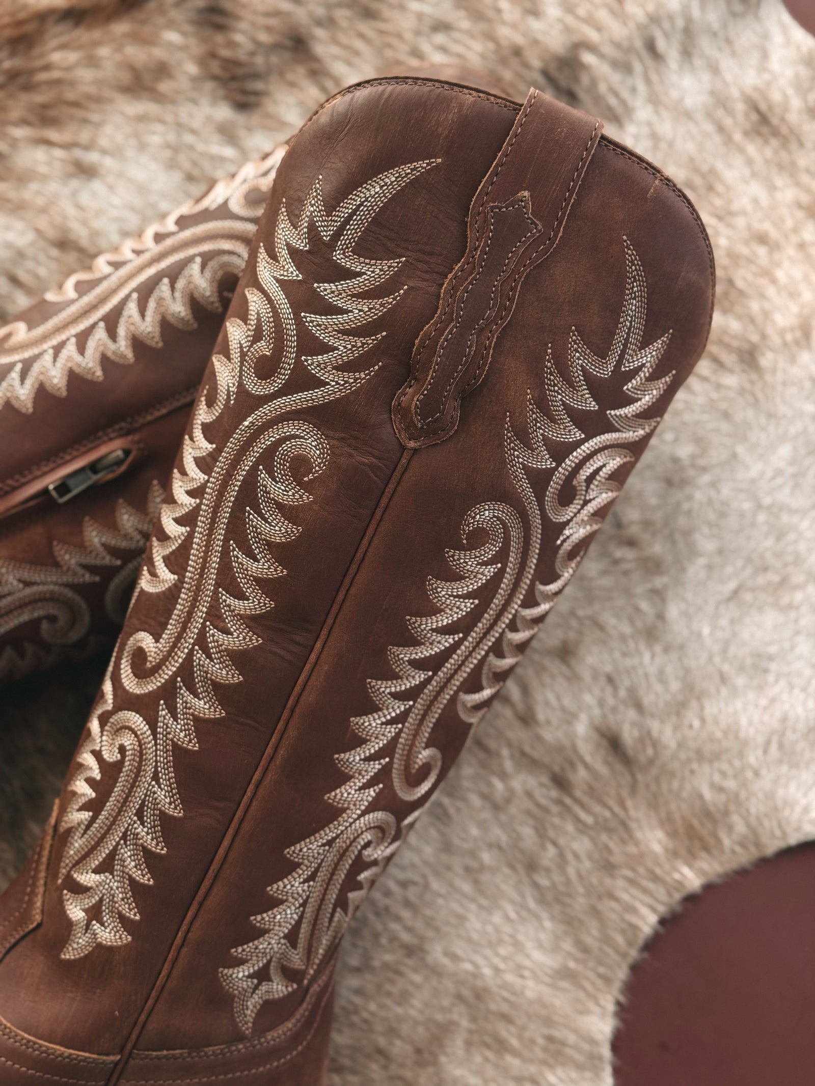 O tipo de bota que chama a atenção a cada passo. Estas botas de cowboy marrons de cano alto apresentam bordados intrincados, uma silhueta western clássica e um salto angulado para a altura ideal.