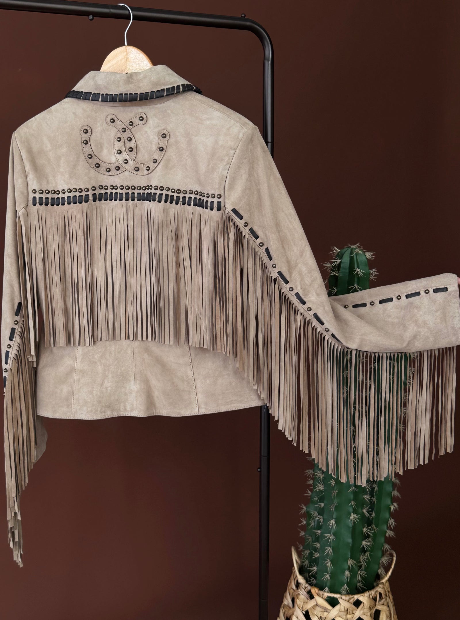 A Jaqueta Horseshoe em Dusty Sand é uma obra de arte western para vestir. Feita à mão pela Dakota West Leathers, esta jaqueta com franjas de pulso a pulso é feita de camurça de cordeiro amanteigada e totalmente forrada com uma estampa de seda suave. Detalhes em couro preto, detalhes em tachas e costuras personalizadas em formato de ferradura adicionam profundidade e ousadia à sua silhueta icônica. Seja para um rodeio, show ou momento editorial, esta peça é inesquecível.